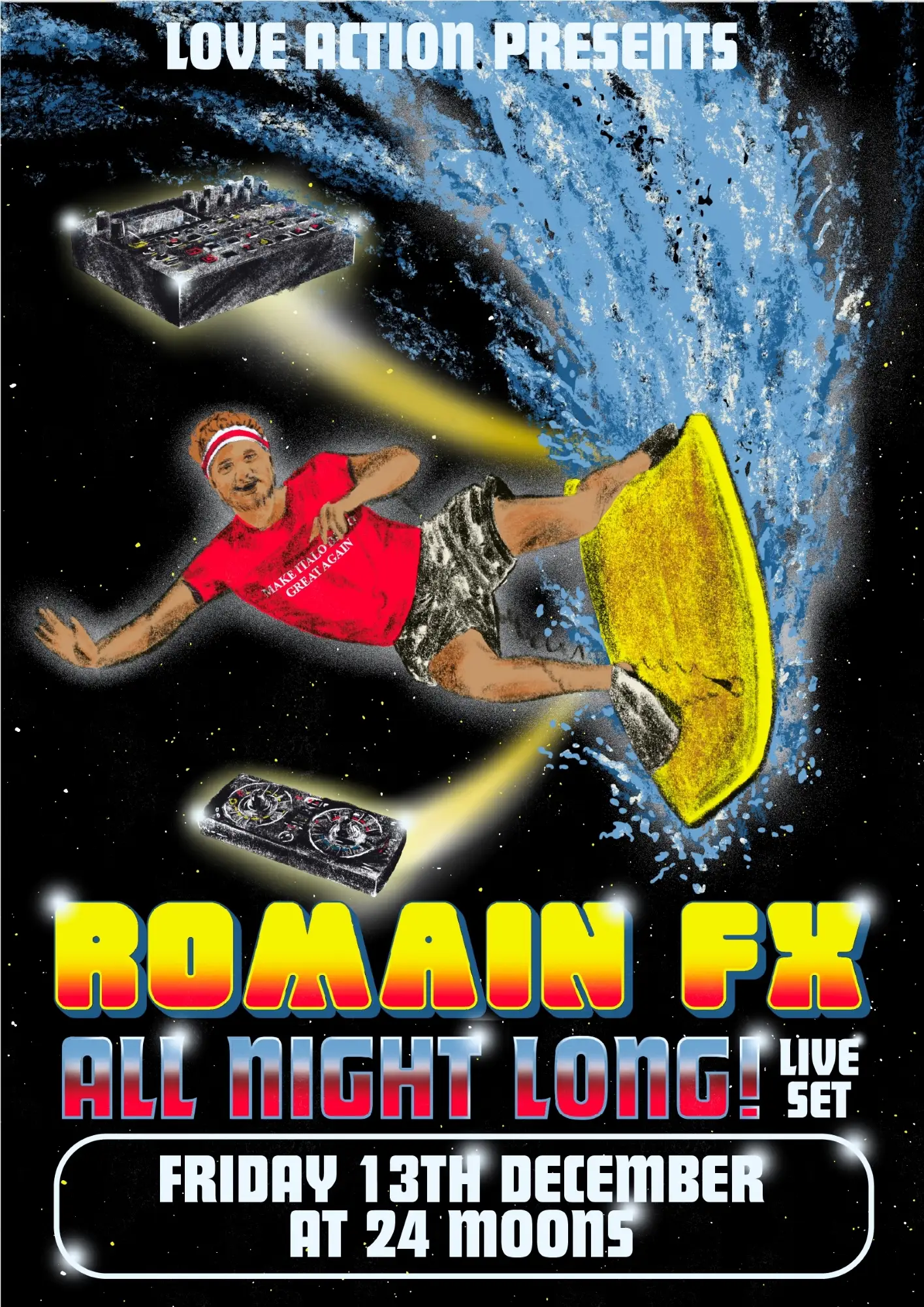 Heavy hitter at Panorama Bar, seasoned producer of over 300 dance floor bomb disco edits, and now featuring a live set that has been lighting up festivals all over Europe, we are stoked to be hosting the maestro of Love Action again, this time for an all night long special. Romain FX has been digging though endless archives of love action cosmic magic for the past 12 years, with a record collection fit to send any party into the stratosphere. The last time Romain stepped upon love action he brought a masterclass of dance floor euphoria to a HEAAAAVING sold out 24 moons. This time he’s lugging HI TECH LOVE ACTION EQUIPMENT to provide the puntaz with a HINRG live set.