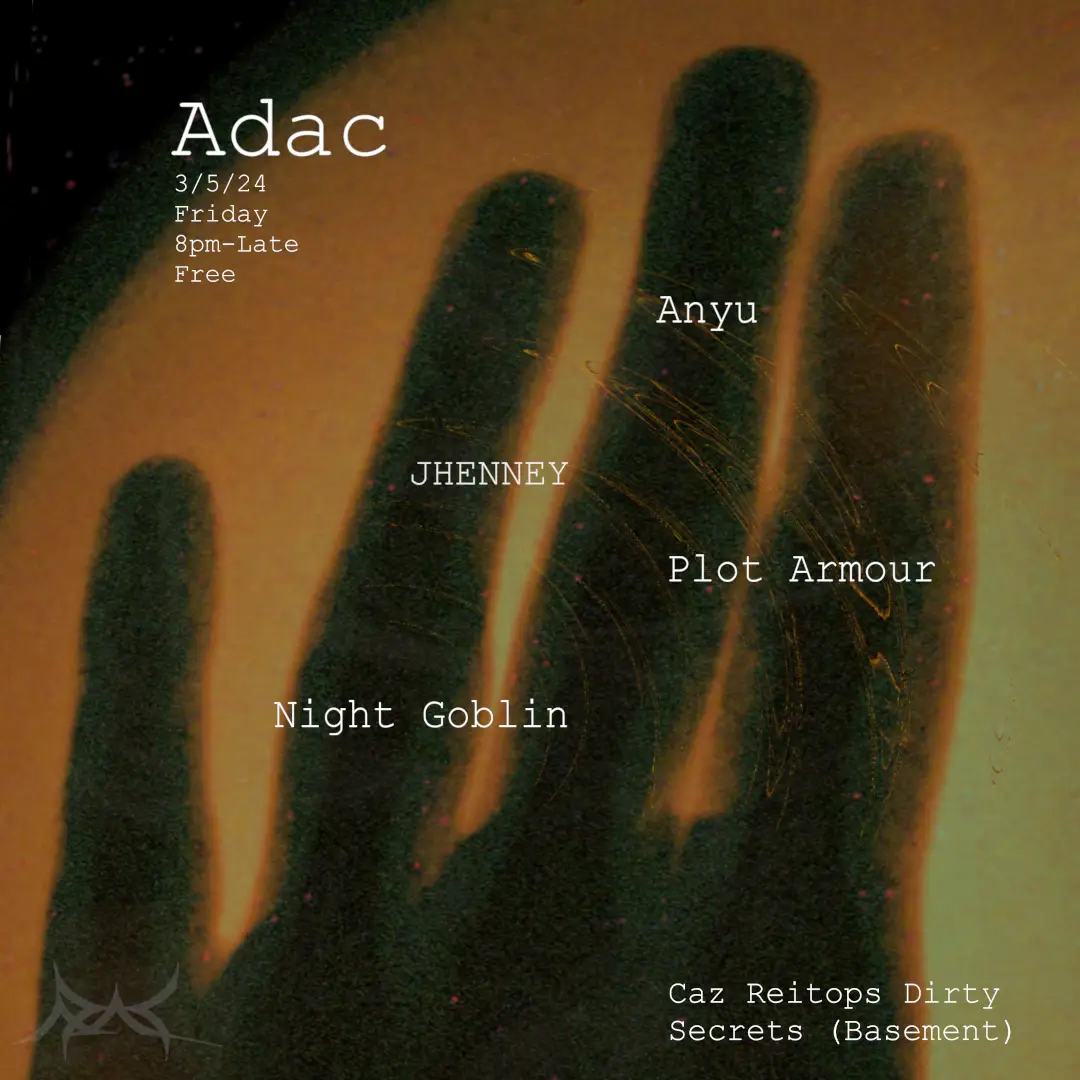 Adac comes to together to present and welcome Anyu & JHENNEY for a night of music and dance. As per usual, this event will take place in the basement of Caz Reitops Dirty Secrets. We look forward to seeing some new and familiar faces <3 -- Regular attendee or a new guest, ADAC is an inclusive and safe space where all can thrive without fear of harm or harassment. Should you witness or experience any ill behavior, please notify our event organizers or Caz Reitops staff. This event takes place on the land of the Wurundjeri People of the Kulin Nation. We acknowledge and pay our respect to elders past, present and emerging. Sovereignty was never ceded. This always was and always will be Aboriginal land. Unfortunately this event is not wheel chair accessible.