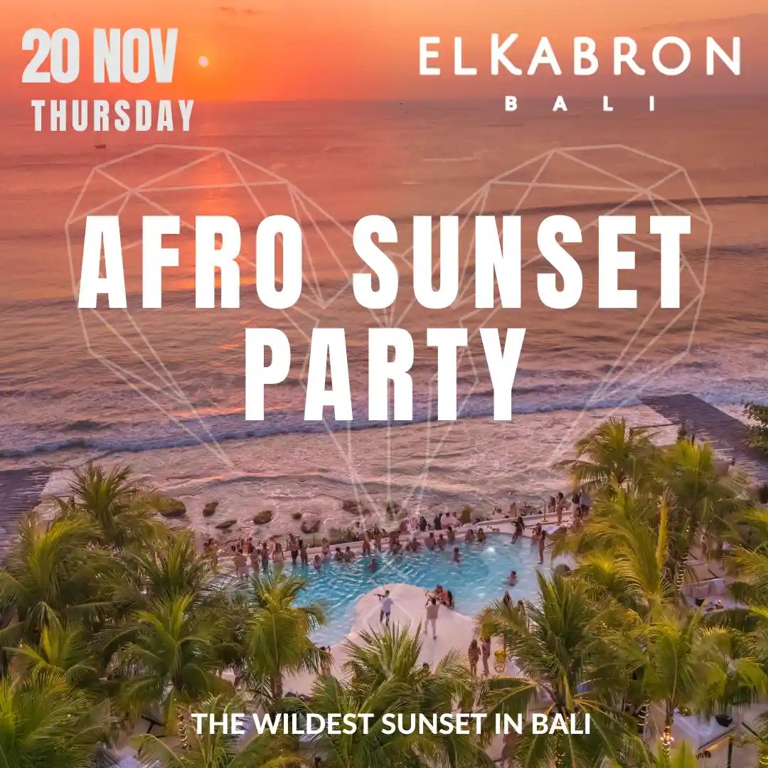 Every Thursday in Uluwatu - extraordinary Afro Sunset Party in El Kabron Bali with afro house DJ sets all day long, drums, sax, violin, and the wildest sunset in Bali! DJ Sessions all day long from 11AM until midnight. Afro Sunset Party in El Kabron Bali starts at 3PM with live performances at the edge of the ocean followed by the magical sunset and dancing with a rhythm all night.