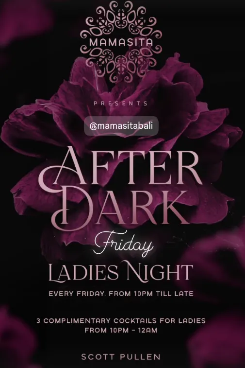 Get ready for the ultimate Friday night vibes at Mamasita Bali with "After Dark" featuring Scott Pullen! Every Friday night, starting from 10 PM till late, join us for an electrifying DJ session that will keep you grooving until the early hours. Ladies, we've got something special for you! From 10 PM to 12 AM, enjoy three complimentary cocktails as our way of adding a little extra sparkle to your night.