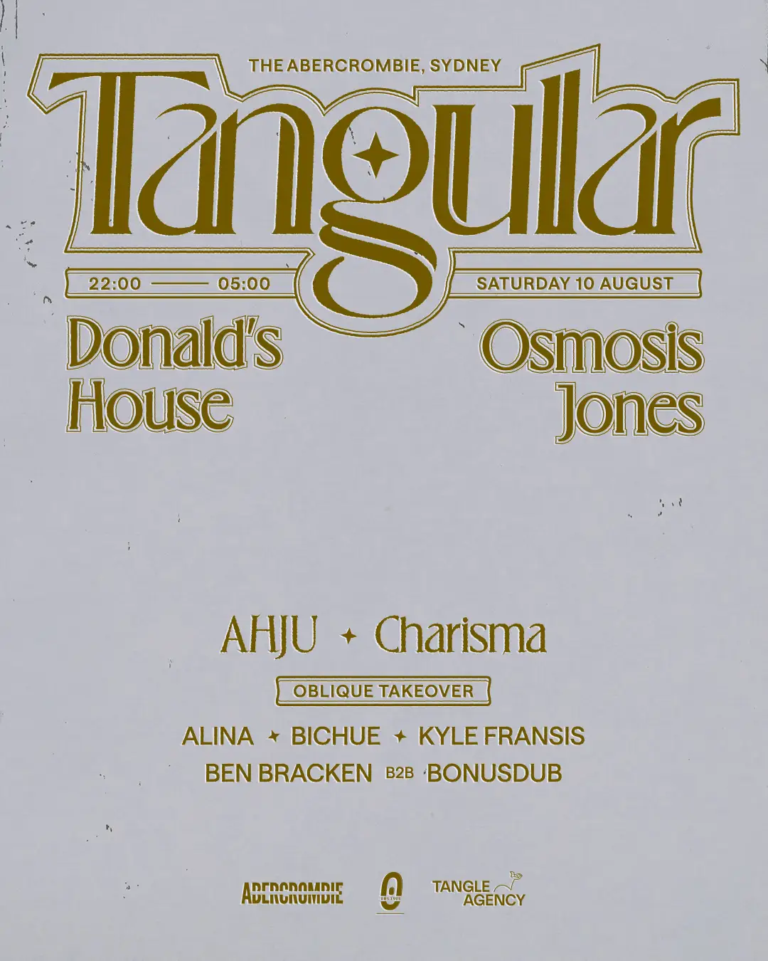 Tangle Agency presents Tangular, a double-header club showcase at The Abercrombie Hotel on Saturday August 10th for all things tech-house, progressive and UKG, with the second room programmed by Oblique Records. Featuring Naarm based Tangle Agency DJs Donald’s House, Osmosis Jones and Charisma, alongside Eora locals Alina, AHJU, Bichue, Kyle Fransis & Oblique DJs. Line-up: AHJU Alina Bichue Charisma Donald’s House Oblique DJs Osmosis Jones Kyle Francis Artwork: Designed by @ryanelliss.design We acknowledge that this event is held on the stolen lands of the Gadigal people of the Eora Nation. We pay our respects to Elders, past, present and emerging. Sovereignty was never ceded.