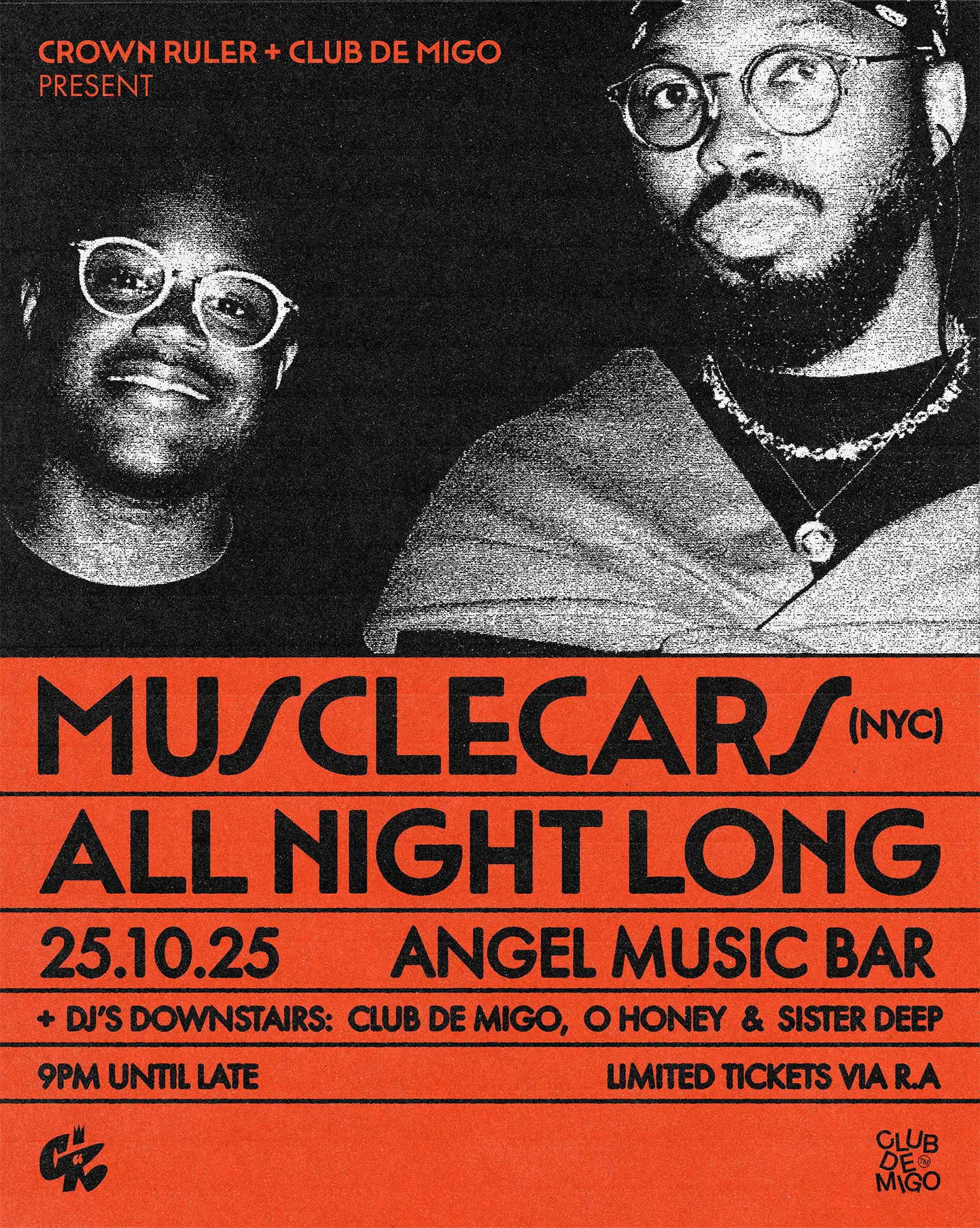 Musclecars return to Naarm for a rare and intimate extended session upstairs at Angel Music Bar. Across 6 golden hours, lock-in for a real special treat as Musclecars dig deep for an up close and personal vibe that will be remembered as one of those "you had to be there" moments. Tickets are strictly limited and bound to move quickly. Commit to the bit before it's too late. * * * * * * * * * * * * * * * * * * * * * * * * * * * * * * * * * * * * * * * * * * * * * * * * * * * SET TIMES Upstairs: 22:00 - 05:00 | Musclecars Downstairs: 21:00 - 23:00 | Club De Migo 23:00 - 01:00 | O Honey 01:00 - 05:00 | Sister Deep
