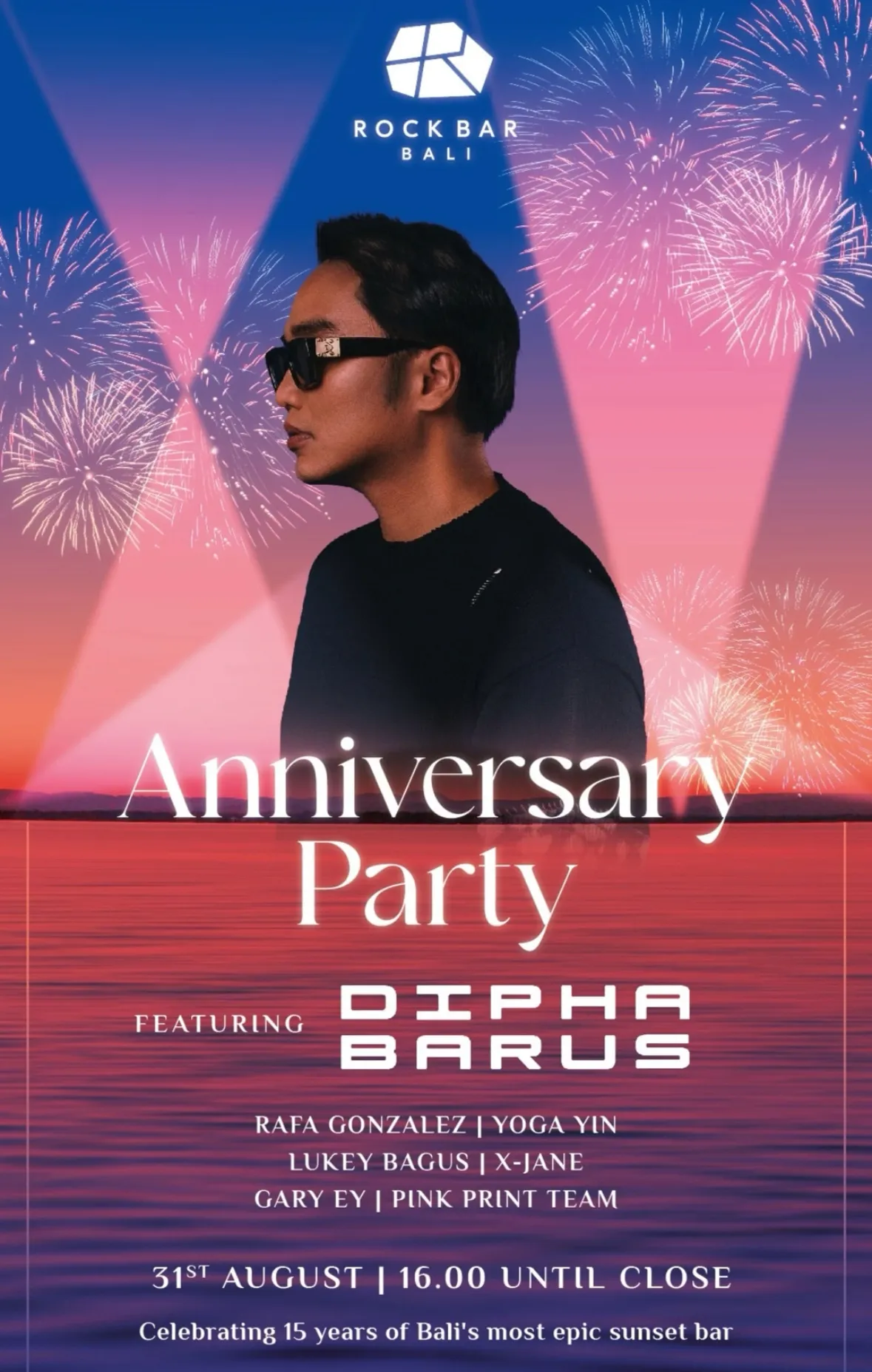 Mark your calendar for Rock Bar, Bali's XV Anniversary Party on Friday, August 31st, featuring six incredible headliners. Be sure to secure your reservation now! DJ Line-Up: - DHIPA BARUS Featuring: - Rafa Gonzalez - Yoga Yin - Lukey Bagus - X-Jane - Gary Ey Performance By: - Pink Print Team Early Bird Ticket: IDR 400,000 net, which includes 2 drinks (1 selected alcoholic and 1 selected non-alcoholic). Don’t miss out on this exciting celebration!