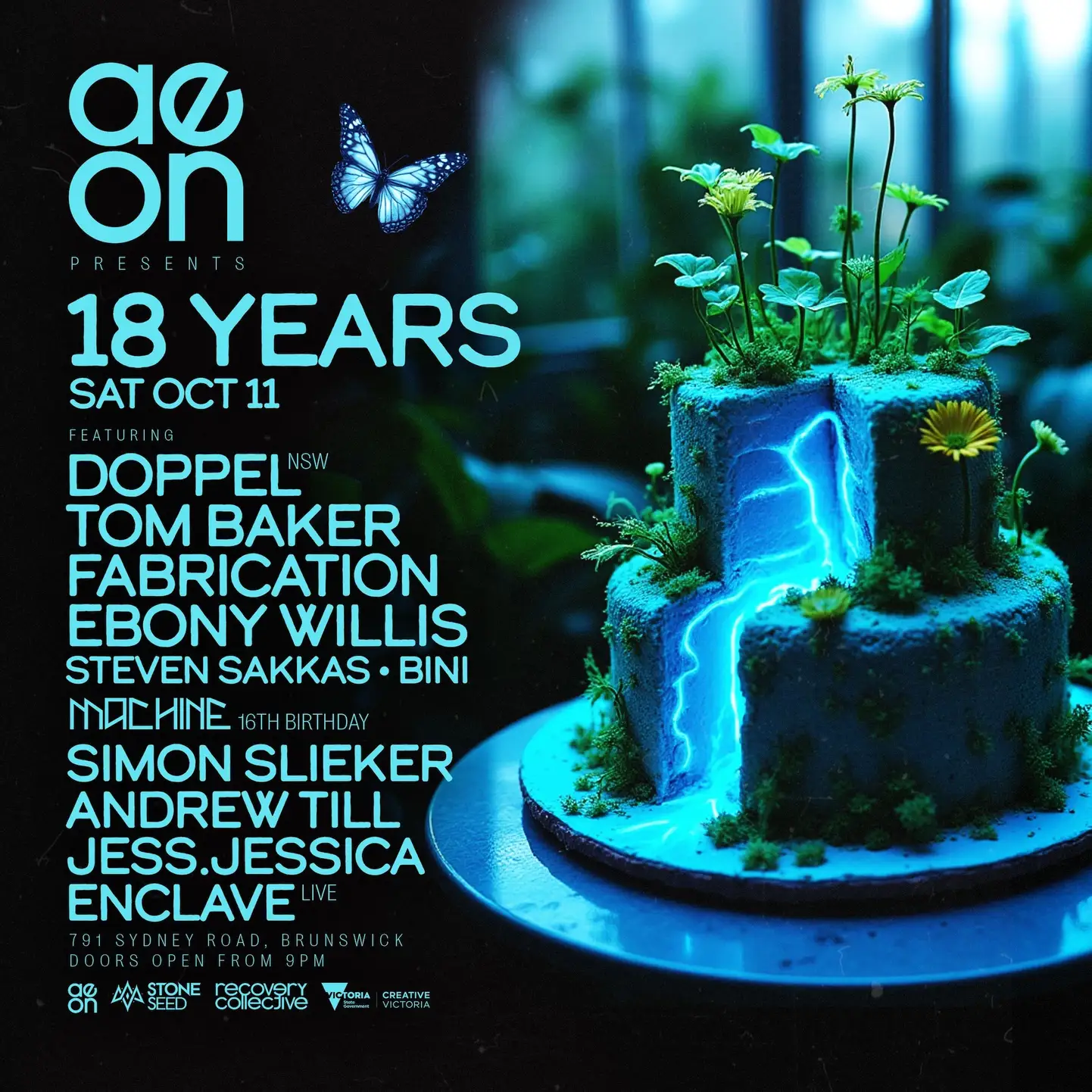 18 YEARS OF MY AEON Saturday, October 11th Eighteen years of music, movement, and memories. My Aeon has stood as one of Melbourne’s most loved underground institutions, and this October we mark a milestone: 18 Years of My Aeon. This is a celebration of nearly two decades of connection, music, and the dancefloor magic that has defined My Aeon. Join us for a full-venue celebration across both floors, featuring a stacked lineup of some of our favourite artists past and present, Funktion-One sound, and immersive production that will honour the roots of My Aeon while looking toward its future.