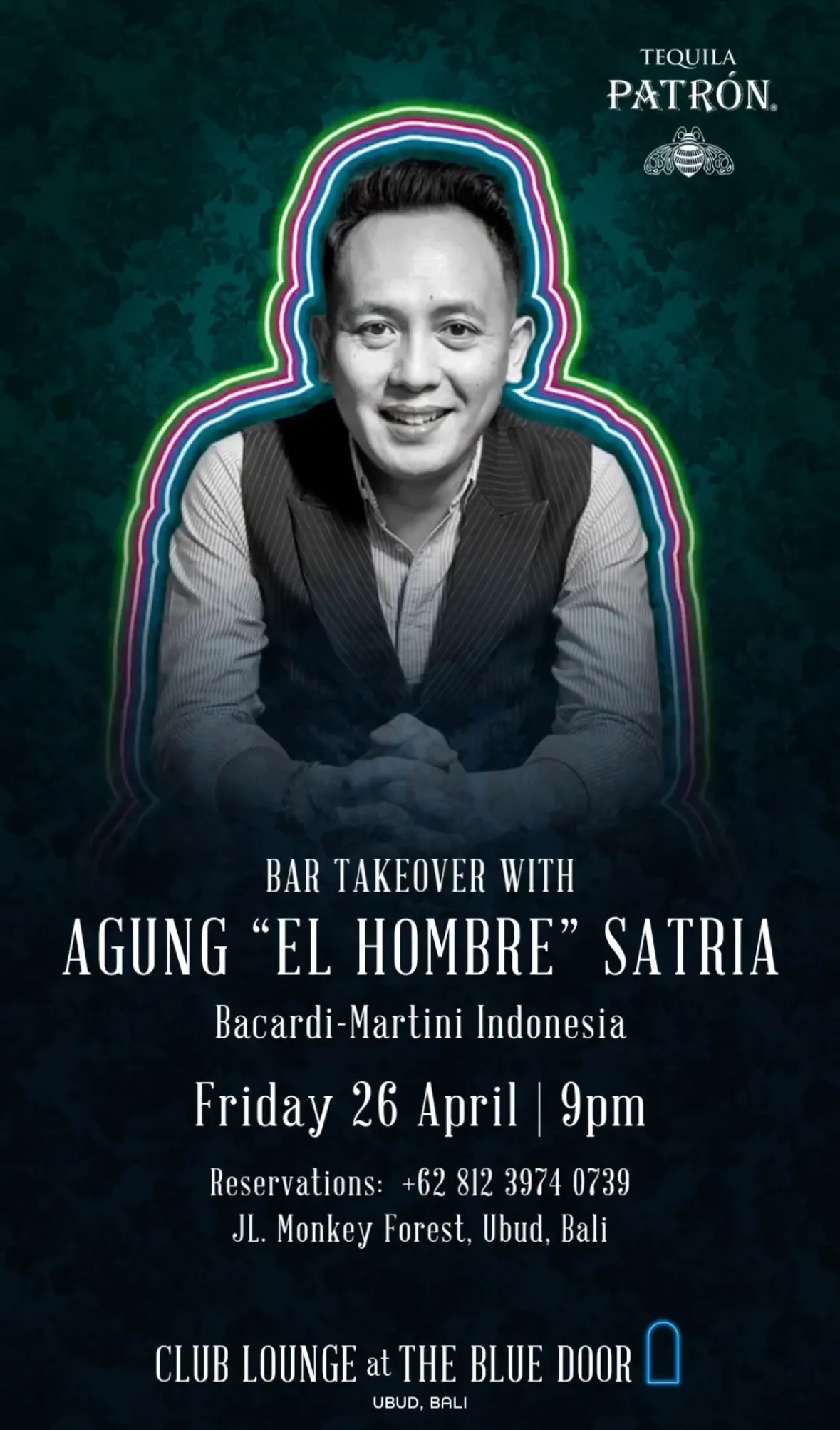 Get ready for an electrifying night as Agung "El Hombre" Satria from Bacardi Martini Indonesia takes over the bar at The Blue Door Bali this Friday, April 26th, 2024, starting at 9 PM. Prepare to experience a unique blend of cocktails and flair as Agung showcases his expertise behind the bar, crafting signature drinks that are sure to tantalize your taste buds and elevate your evening. Join us for a memorable night filled with top-notch drinks, great music, and fantastic company. It's an event you won't want to miss!