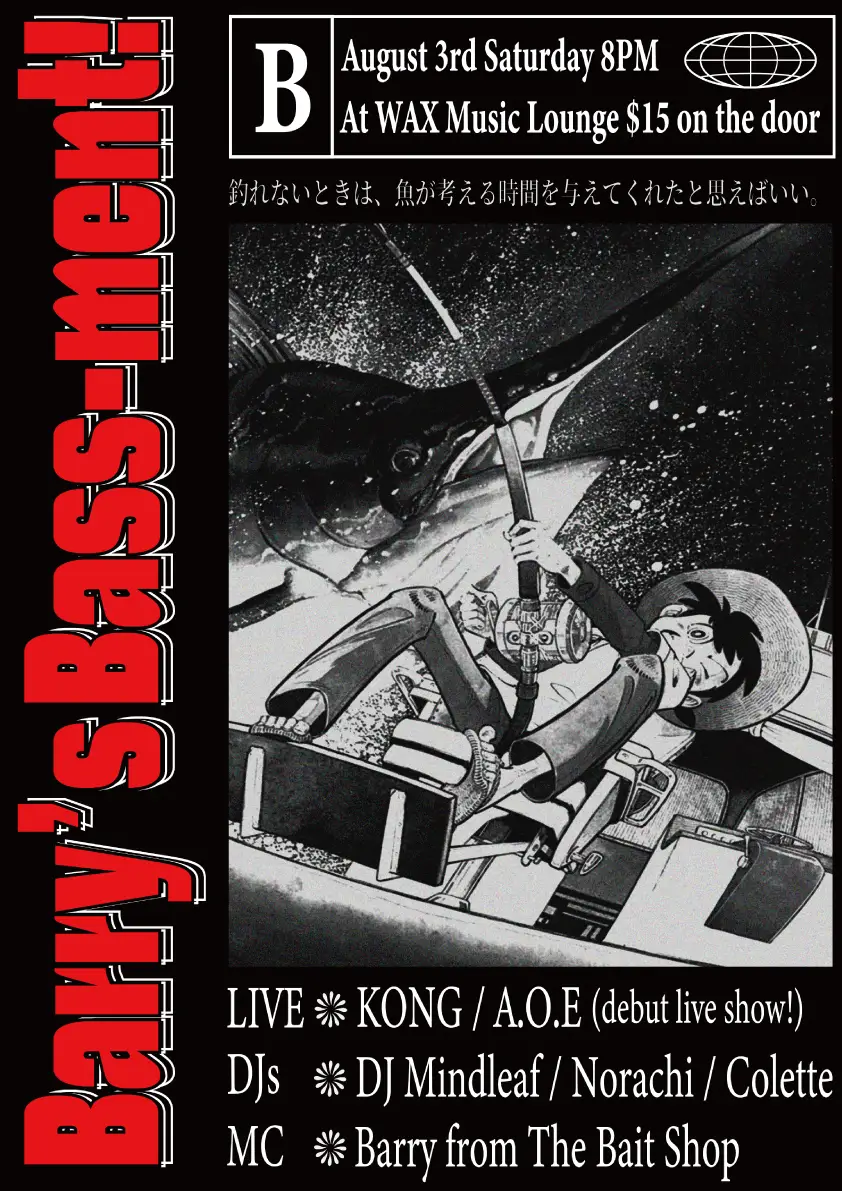 Barry from the Baitshop at Hopkins Creek presents his latest party venture BARRY'S BASS-MENT! Hosted at Wax Music Lounge, the bassy basement affair features the live debut of A.O.E featuring Kris Jenner (Dreamin' Wild/ Swazi Gold), Dex Gregg (Zobs Palace) and Barry Sunset. Local 6-piece dub purveyors KONG will be laying down live dubby grooves. DJ Mindleaf, Colette & Norachi will be on selections throughout the evening. Your host with the most Barry from the Bait Shop!!