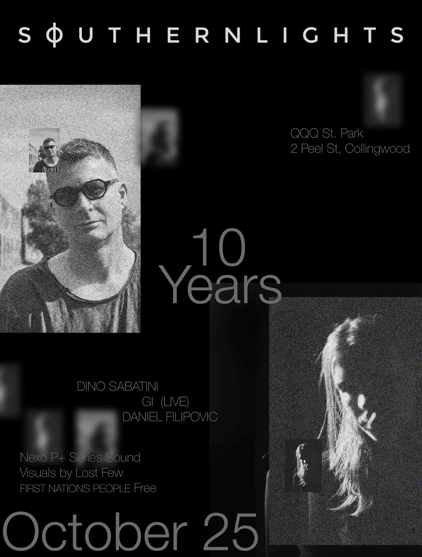 Southern Lights celebrates 10 years as an independent record label pushing the boundaries of elemental music from experimental and ambient soundscapes to contemporary techno. Headlining the 10-year anniversary party is Dino Sabatini. The Rome native is an artist whose strong body of work has helped to develop his local scene and redefine what it means to work with electronic music in the 21st century: though his sounds are completely modern, synthesized and rendered with crystal clear production, he continues to tend the deep roots of lost wisdom and mythology that have sustained human creativity for millenia. His collaboration as Modern Heads delivered one of the early releases in the Southern Lights catalogue and 2026 will see new collaborations between Dino and the label. Gi hails from Gadi (Sydney) and is part of a fresh wave of artists at the forefront of contemporary and experimental techno. Her distinct approach to generative sound design sees her work skirt the grey zones between ambient, IDM and techno, and in 2024 she launched the World of Knots label. She will performing a live set on the night. Daniel Filipovic is the founder and co-curator of Southern Lights together with Amsterdam-based Carlos Nascimento. As a DJ, his sets are a reflection of how he curates the label, taking in all things esoteric and forward thinking: from ambient, drone and dub-infused sounds through to halftime, hypnotic and experimental techno, championing vinyl as his sonic weapon of choice and drawing from a deep collection of records spanning 20+ years as a selector, collector and label owner. All artists will be performing on Wurundjeri land. We acknowledge the Wurundjeri people of the Kulin Nation as the traditional custodians of that land. We pay our respects to their elders past, present and future. Sovereignty was never ceded. Sound: Nexo P+ Series Sound Visuals: Lost Few Southern Lights merch available on the night First Nations People Free (email southernlights.melbourne@gmail.com)