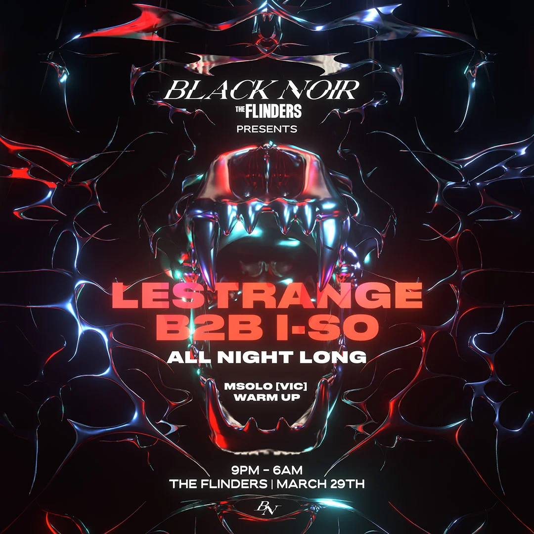 BLACK NOIR presents: LeStrange B2B I-SO All Night Long! LeStrange is back! Another wild nigth awaits, with I-SO joining LeStrange for a special all night long performance, every time these two play together the energy is wild and full on, you never know what to expect. MSOLO the Melbourne based artist will be warming up the night for the first two hours. This is really a top class night you do not want to miss! The energy will be insnane! LESTRANGE LeStrange has been responsible for some of the biggest tracks this year inn hard techno! The Neo Rave style he produces has taken the scene by storm with their tracks being played by all the biggest DJs in the scene at the biggest events in the scene. The combination of old school rave sounds and unreal impact on the drops has been moving crowds all over the world! LeStrange has just finished his tours in Europe, South America and India, and is now back in his home... the CAGE! I-SO Steve Brazel who is known as a I-SO on stage, has always had an unwavering love for techno since first hearing and falling in love with the genre in Berlin in 2019. Ever since that decisive week his life changed, becoming a tunnel vision that was solely focused on Techno music, in particular he loved the harder and darker sounds of the genre. His passion for the music lead him to make a change in the Sydney music landscape with the founding of BLACK NOIR in 2021 hosting the first event in a WW2 bunker, since then the brand has gained global recognition and respect. During the journey of the brand he was surrounded by many dj's who convinced him to try and play the music himself. Since he began playing he has looked to push further with his own career of sound, carefully selecting his very own unique style behind the decks which is best described as: a sound that envelopes you with its intensity while keeping you harmoniously dancing to the driving rhythm. It will be a special night, no doubt about it! After time behind the decks he turned his attention to is producing and I-SO has achieved a release in the top 20 in the Beatport hard techno charts in a short period of time! Be sure to keep an eye on what is next for I-SO because this indeed really is just the beginning for this artist and his passion for techno is stronger than ever! MSOLO [VIC] WARM UP SET We recognise this event takes place on stolen Gadigal land of the Eora Nation. We acknowledge the traditional owners and pay our respects to Elders, past, present and emerging. Sovereignty was never ceded. Details: 29TH MARCH 2025 9PM - 6AM THE FLINDERS