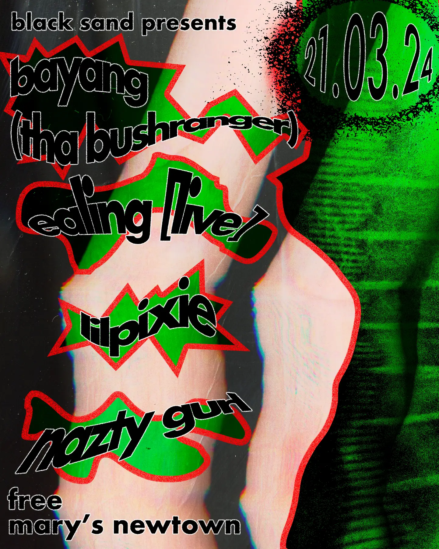 Great Southern Nights, Mary’s Newtown and black sand are proud to present BAYANG (tha Bushranger), ealing [LIVE] and LILPIXIE. A night of forward-thinking hip-hop and electronic music, these are Eora’s most exciting artists, harnessing their incredible talents as solo and collaborative musicians. BAYANG (tha Bushranger) has fast-established himself as one of the city’s most prominent new voices. His raging live show and cross-pollination of hip-hop, punk and noise has endeared him to audiences throughout Dharug, Eora and Naarm. ealing is a producer and DJ making music on the forefront of Internet culture, absorbing the sounds of electronic and hip-hop, presenting it on their own terms. Their raucous live set has become a scene staple, a holistic display of their style traversing remixes, edits and their unique original production, selling out the late Shades Bar and supporting Vegyn at Club 77. 20-year-old queer, alt-artist LILPIXIE is taking over the Western Sydney music scene. Beginning on Soundcloud with influences such as ABRA and CLIP, LILPIXIE is redefining the boundaries of rap through their heartfelt lyricism. What originally began as a coping mechanism to heal trauma is now creating waves in the city’s underground. While significant solo artists, their collaborations come together as a sum greater than their parts. Hailed by Acclaim Magazine as “[capturing] the feeling of being terminally online”, ‘KANDINSKYY’ is the first collaborative offering from ealing and BAYANG, a track that pays homage to the halcyon days of DJ Drama and early mixtapes, while also drawing inspiration from the zenith of Memphis phonk. BAYANG and LILPIXIE see eye-to-eye on ‘GANGA’, a fan favourite from mixtape Antarctica seeing both artists share bars on top of bubbly, poppy production from Eora duo AGONY. ealing and LILPIXIE combined forces on ‘On the Block’, a clubby hit from EP Melody Gardens that has already moved dancefloors across the city. Holding the whole evening down is DJ Nazty Gurl, one of the most trusted sources of sound in the city. Artist manager, host of FBi Radio's JUICE, and co-founder of female, non-binary and trans-focused writing camp One Off Traks, Nazty Gurl may be new to the decks but is in no way new to the scene.