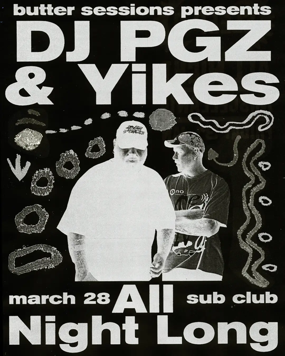 Ouss Ouss. DJ PGZ and Yikes take over Sub Club Melbourne for an all-night journey, celebrating the release of their new EP Come Round on Butter Sessions. From 11 PM till 5 AM, the Naarm and Boorloo-based producers go deep into the sounds that shaped their collaborative record—expect pulsating techno, wub-heavy bass, and breakbeat rhythms primed for the underground. Six hours, two selectors, one relentless session. This event is being held on stolen land. Butter Sessions would like to acknowledge the traditional custodians of this land - the Wurundjeri people of the Kulin nation. We pay our respects to their Elders, past and present.