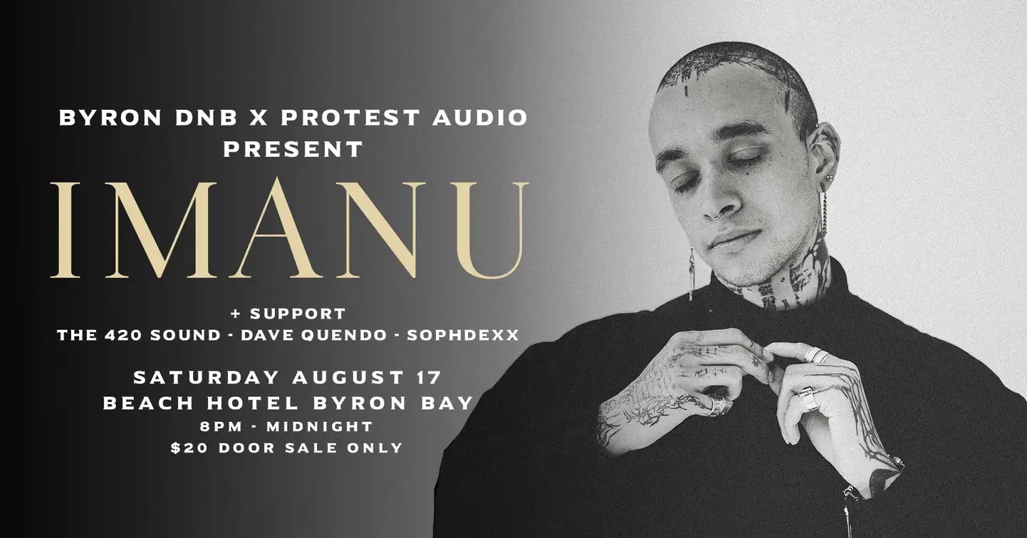 Byron DNB & Protest Audio bringing IMANU - one of the biggest talents in the electronic bass music scene for a massive show in Byron Bay! Getting in the spotlight at the young age of just 16 with brutally unique multi-genre music, IMANU has developed a presence on the bass music scene as one of the greatest producers of the new generation. Now in his twenties, he already released on top notch labels such as Deadbeats, UKF and Vision, and remixed the likes of Apashe, TOKiMONSTA and What So Not & Skrillex, as well as delivering collaborations with artists like Noisia, KUČKA, The Glitch Mob, Flowdan, Pham and Josh Pan. IMANU released the outstanding debut LP “UNFOLD” on Deadbeats in 2022. The EP also saw remixes from Zeds Dead, Subtronics and Machinedrum among others in the “UNFOLD (Remixes)” release, which came out in April 2023. Into 2023, IMANU’s career is taking a step to the next level with performances at the most prominent festivals around the world, most notably at EDC, Shambhala, Lollapalooza, Bonnaroo, and Boomtown, and iconic clubs such as Melkweg in Amsterdam, Red Rocks in Denver, and Aragon Ballroom in Chicago. Coming to Australia after an extensive tour in some of the world's biggest electronic music festivals and events.
