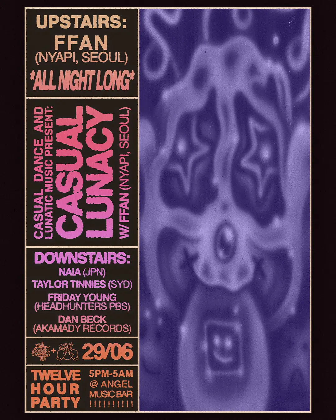 And so the party returns… THIS TIME for a special 12 hours of music, collaborating with friends from across the Timor Sea, CASUAL DANCE to bring the people a day-to-night of CASUAL LUNACY!! UPSTAIRS, we are excited to welcome a legend of the scene for this special occasion, FFAN. When he's not bringing the best to Nyapi Club in his native Seoul, FFAN is moving dancefloors across Asia, Europe and beyond with his multifarious sounds and storytelling in the dub disco, house and techno realms. AND, to make this party a proper one, we’ve got 4 DEEJAYS downstairs for some long haul sets from 5pm! Joining us is NAIA (JPN), Taylor Tinnies (SYD), Friday Young (Headhunters PBS) and Dan Beck (Akamady Records) all the way until close. At Angel Music Bar, of course. See you there????? Lunatic Music acknowledges the Traditional Owners of the land on which this event takes place, the Boon Wurrung and Woiwurrung (Wurundjeri) peoples of the Kulin Nation. We pay respect to their Elders, past, present and emerging. We extend this respect to the Aboriginal Elders of other communities and all First Nations peoples. Always was, always will be Aboriginal Land. If you’re a First Nations person wishing to attend then please DM us. Finally, thank you to Lunatic’s artist in residence, Mimi Libro for the poster