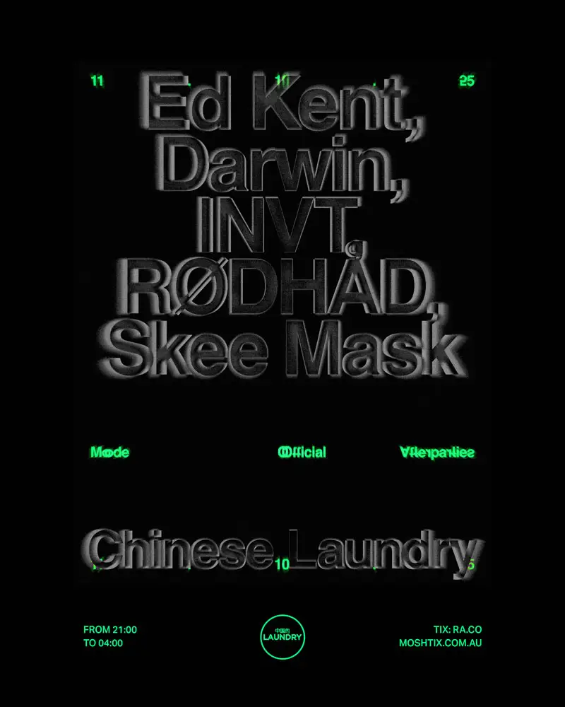 Chinese Laundry X Mode Festival Afterparty. For the first time ever, we are extending our party until 5am! Tickets: • Priority for MODE Festival ticket from 23 September via mailout • General tickets available from 25 September – Laundry [Techno / Breaks] – SKEE MASK [DE] DARWIN [CAN] Techno Set Rødhåd [DE] Sofia Gonzalez – Cave: [Bass / Dubstep / DnB] – INVT [USA] Ed Kent [MEL] Jungist Obeido