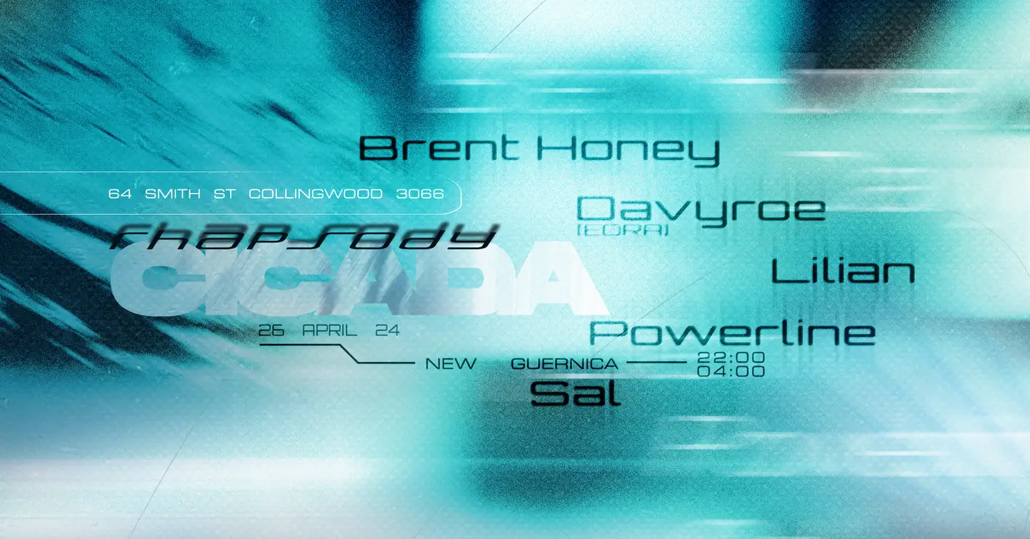 ANNOUNCING: CICADA Rhapsody ft. Brent Honey, Davyroe [EORA], Lilian, Powerline, & Sal. New Guernica, 10pm – 4am Friday the 26th of April 2024. Presale tickets are available via the link in our bio. Location: @newguernica 64 Smith Street, Collingwood 3066 CICADA & New Guernica proudly introduce “CICADA: Rhapsody”, a fervently passionate or ecstatic manifestation of emotion. Join us on the 26th of April, for our momentous return to the iconic New Guernica. A bunch of new faces joining us for this one, and we cannot wait to see them soak up the moment. Programme [a-z]: ► BRENT HONEY [ @brenthoney_ ] ► DAVYROE [ @davyroe_ ] ► LILIAN [ @lilianchabannes ] ► POWERLINE [ @p0werl1ne ] ► SAL [ @sal__l ] Creative Design: @sole.studi0 CICADA and New Guernica acknowledge and pay their respects to the Traditional Custodians of the land, the Bunurong Boon Wurrung and Wurundjeri Woi Wurrung peoples of the Eastern Kulin Nation of which this event is taking place. We pay our respect to their Elders past, present and emerging.