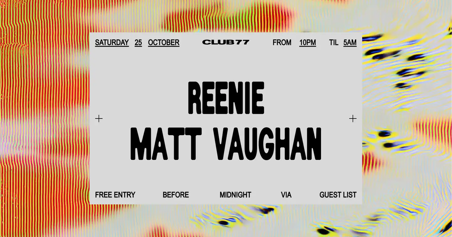 Club 77: Reenie, Matt Vaughan - ✦ Saturday 25th October ✦ Reenie, Matt Vaughan ✦ 10:00pm - 5:00am ✦ Free entry on guest list before 12am ✦ $25.00 After - This event takes place on stolen land. Free entry for all First Nations people and is also offered for those who require it. DM or email contact@club77.com.au for access. Club 77 is an ally to the LGBTQI+ community and a safe space for freedom and expression. We have zero tolerance for transphobia, homophobia and racism. - Dance | Explore | Connect | Manifest Celebrating 28 years as a hub for local club culture and a safe space for freedom and expression.