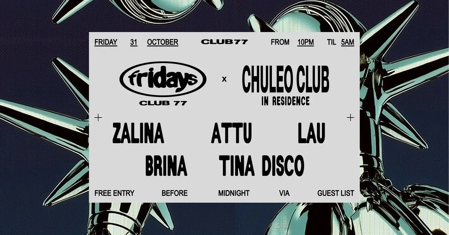 Fridays at 77 x Chuleo Club: Zalina, Tina Disco, Attu, Lau, Brina - ✦ Friday 31st October ✦ Zalina, Tina Disco, Attu, Lau, Brina ✦ 10:00pm - 5:00am ✦ Free entry on guest list before 12am ✦ $15.00 After - This event takes place on stolen land. Free entry for all First Nations people and is also offered for those who require it. DM or email contact@club77.com.au for access. Club 77 is an ally to the LGBTQI+ community and a safe space for freedom and expression. We have zero tolerance for transphobia, homophobia and racism. - Dance | Explore | Connect | Manifest Celebrating 28 years as a hub for local club culture and a safe space for freedom and expression.