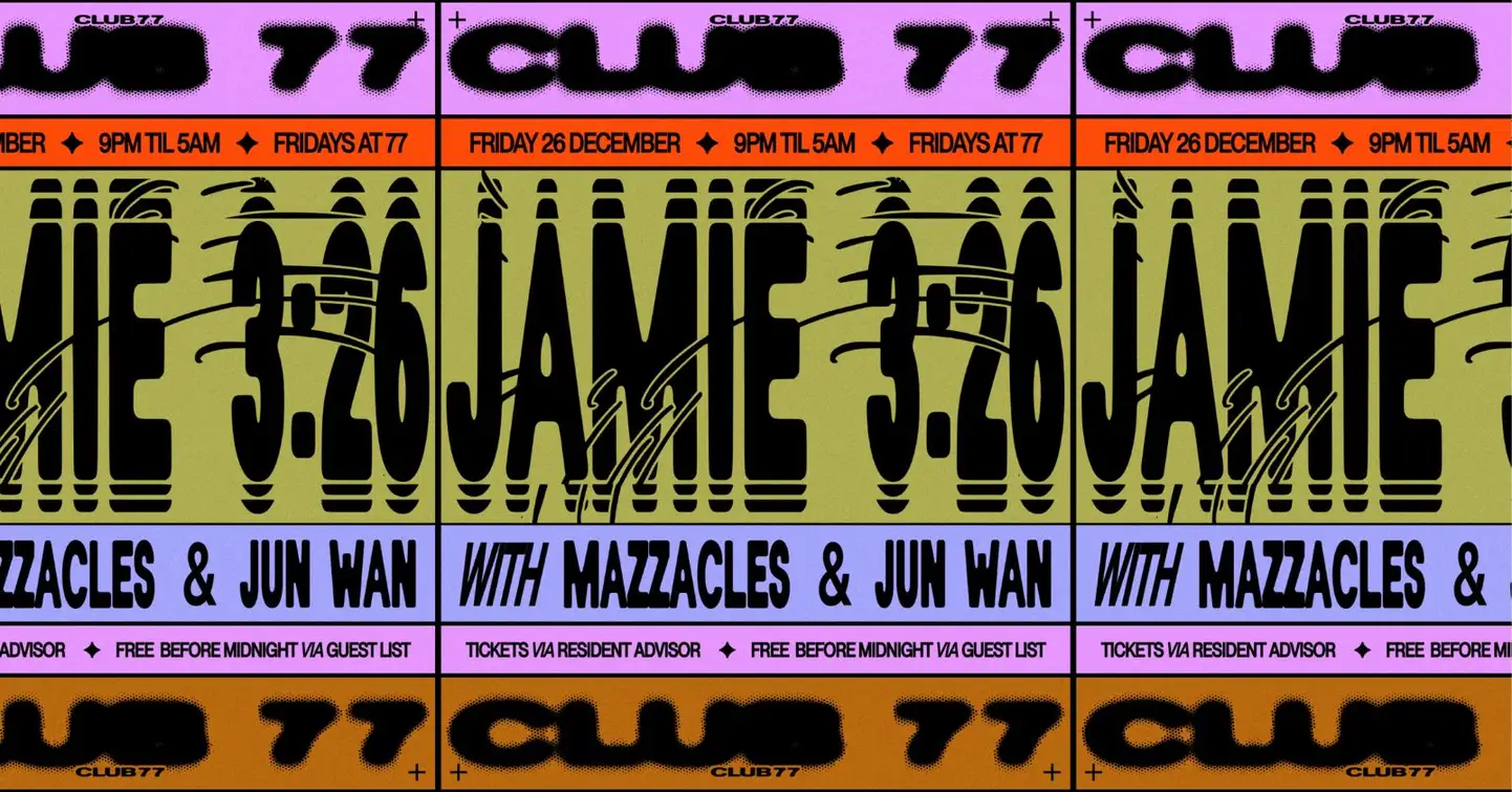 Club 77: Jamie 3:26 (Chicago), Mazzacles, Jun Wan - ✦ Friday 26th December ✦ Jamie 3:26 (Chicago), Mazzacles, Jun Wan ✦ 9:00pm - 5:00am ✦ Free entry on guest list before 12am ✦ $25.00 After - This event takes place on stolen land. Free entry for all First Nations people and is also offered for those who require it. DM or email contact@club77.com.au for access. Club 77 is an ally to the LGBTQI+ community and a safe space for freedom and expression. We have zero tolerance for transphobia, homophobia and racism. - Dance | Explore | Connect | Manifest Celebrating 28 years as a hub for local club culture and a safe space for freedom and expression.