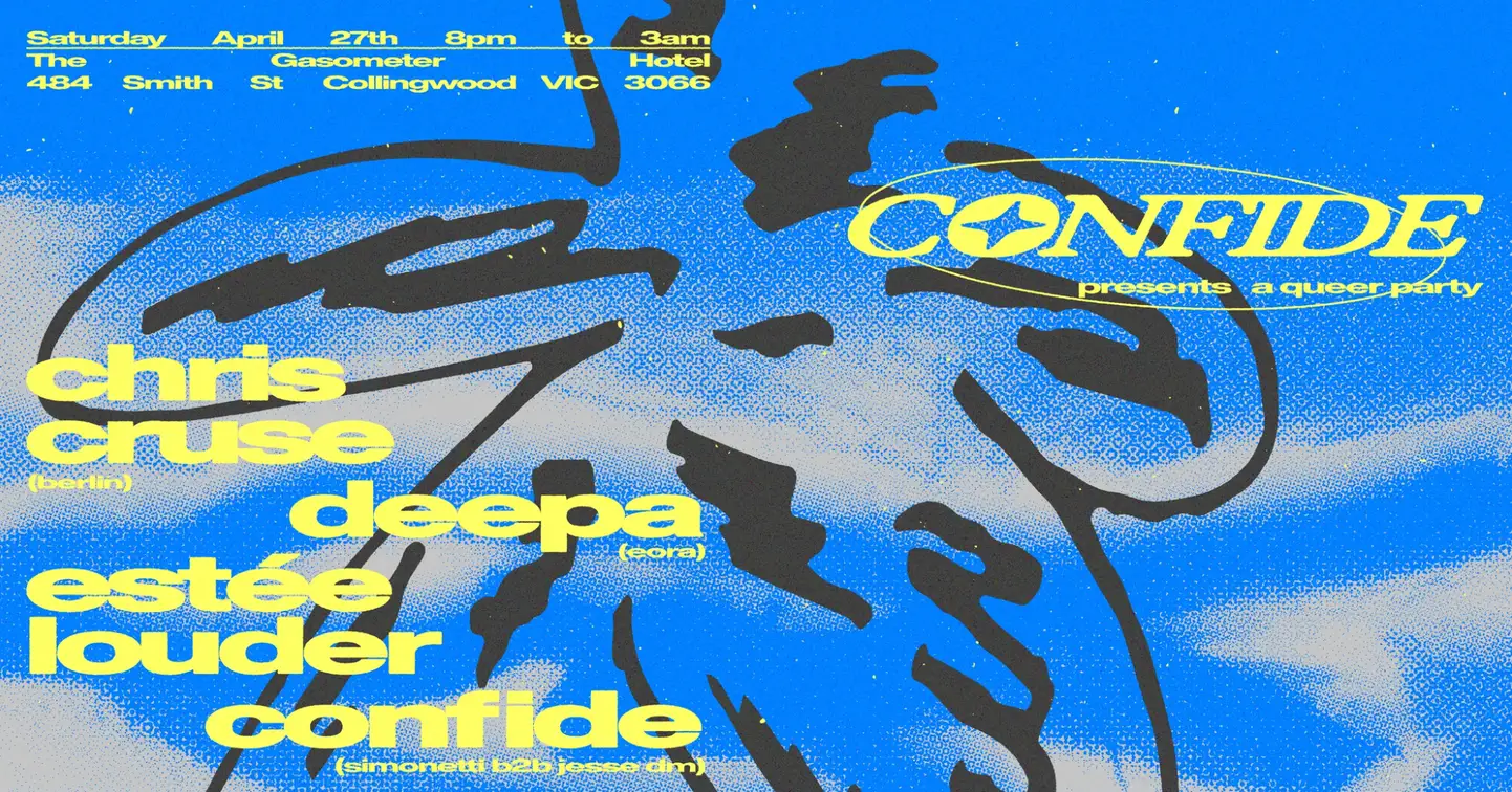 After a string of huge Sundays, we’re taking CONFIDE back to Saturday night baby! Joining us is Chris Cruse, founder and resident of the Los Angeles queer party Spotlight. Now based in Berlin, Chris is a regular at Panorama Bar, Snax, Cocktail d’Amore, as well as festivals such as Glastonbury and Coachella. Through Spotlight, Chris aims to celebrate the queer roots of house, techno and disco, and his recently launched Spotlight Records unearths overlooked queer dance music from the past and present. Plus we’re excited to welcome expert selector Deepa, joining us from Eora (Sydney), as well as founder of Sydney queer club night Control, the iconic Estée Louder.