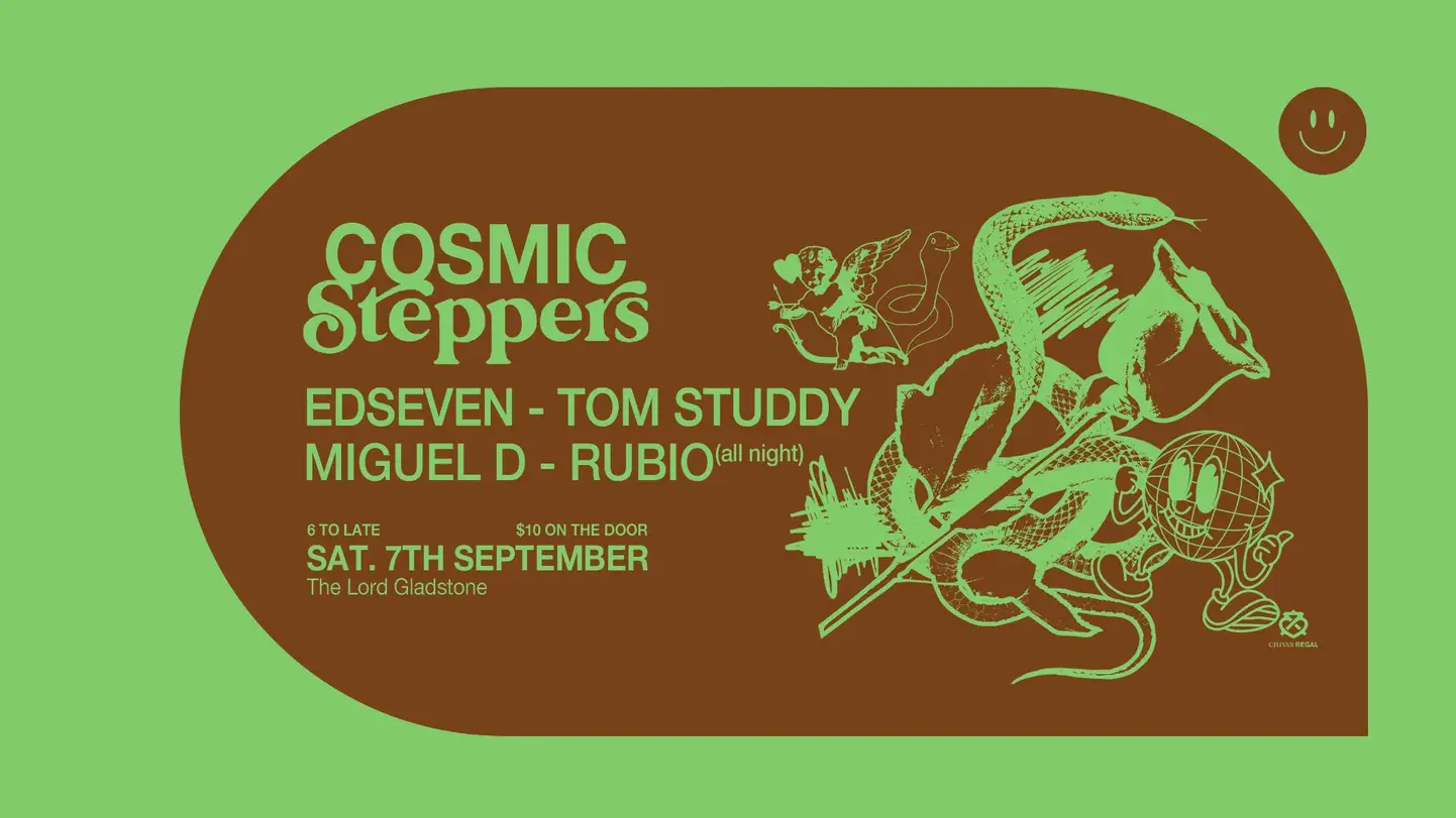 Cosmic Boogie and Steppers join forces for an extendo boogie in the Gladdy courtyard. We've got Edseven, Tom Studdy, Miguel D, and Rubio going b4b until they tell us it's time to turn it off. You know what to expect, gorgeous sounds all afternoon and into the night from jazz sticks and wax discs propelled along in expert fashion by long-time music heads. *Art by Mitch Chadban **Cosmic Boogie would like to acknowledge that this event, and all of the work that we undertake, happens on stolen land. We wish to acknowledge the traditional and original owners of the land on which this event takes place, the Gadigal people of the Eora Nation. We pay respect to those who have passed before us and acknowledge today’s Aboriginal people as the custodians of this land. Sovereignty never ceded!