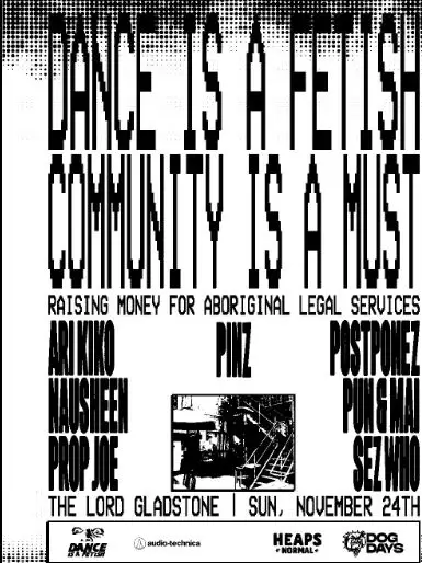 Dance Is A Fetish breakaway from their behind the scenes work to deliver an event open to all, partnering with Dog Days and The Lord Gladstone they've put together a fundraising event to raise money for friends and neighbours Aboriginal Legal Services. (All proceeds donated).