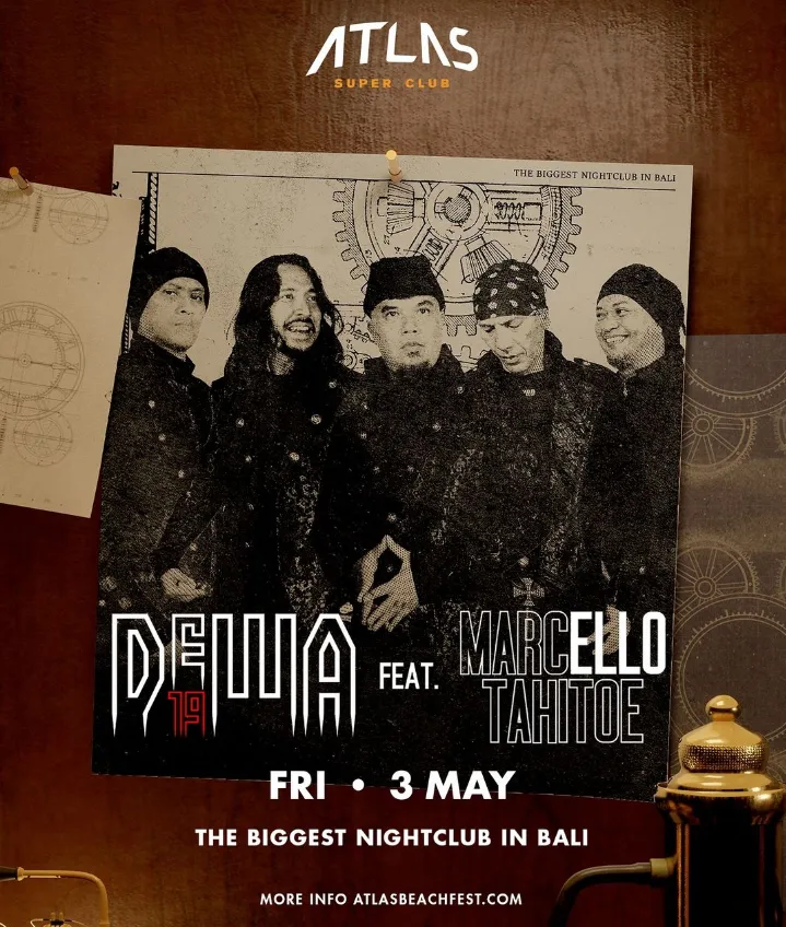Experience the legendary Dewa 19 with Marcello Tahitoe live at Atlas Super Club on May 3rd! Prepare for an evening filled with the timeless hits of Indonesian music as these icons grace the stage. Location : Atlas Super Club Date : May, 3rd 2024 Tickets: General Admission 250k