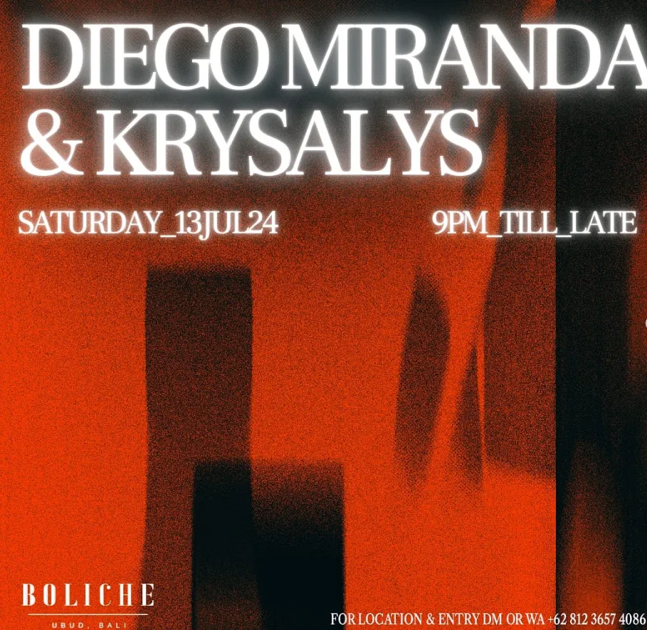 This Saturday Join us for a mesmerizing evening with DIEGO MIRANDA and KRYSALYS! Organic & Melodic House Starting at 9 PM, they'll take you on a journey into the late-night hours. Experience the magic of their music and immerse yourself in the vibes of organic and melodic house!