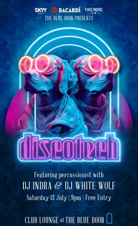 Don't miss out on the ultimate Discotech night at The Blue Door on Saturday, July 13th! Enjoy live percussion by @dodypercasso and DJ sets by @indrakillaa and White Wolf, who will be spinning the hottest beats. Experience an unforgettable evening filled with music and incredible vibes.