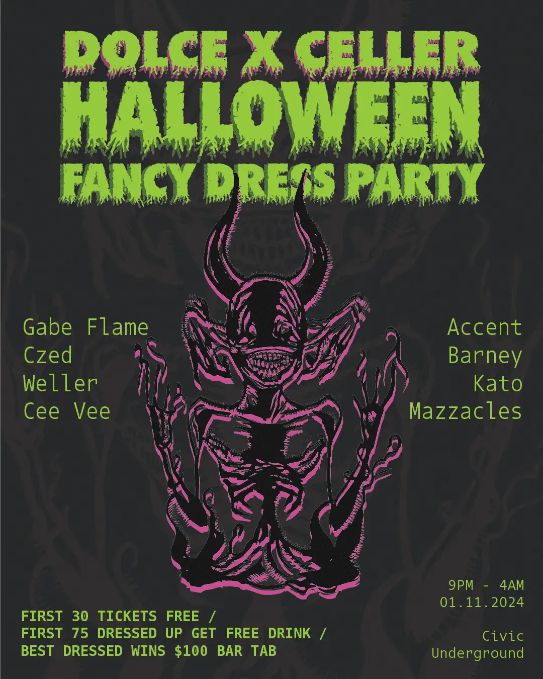 Emergency! On Nov 1, Dolce and Celler need your help to slay the supernatural beings that are running rampant inside Civic Underground. Over the years, numerous ghosts, ghouls, freaks, creatures and monsters who were once DJs, punters, bartenders, security guards, drummers, and bass players inside the club have begun reigning terror upon all of it's patrons. Please don't mistake these beings for your friends, they are evil and mischievous. We have recruited an outstanding strike force of DJs to assist you in vanquishing these evil beings, including Club 77 residents Barney Kato and Mazzacles, BeAvantGarde resident Accent, as well as Dolce and Celler's own residents, Czed, Gabe Flame, Weller and Cee Vee. These creatures hate to see people dancing inside their venue and will migrate elsewhere if the dancefloor is too strong. Unfortunately for these beings, our policy is no bullshit, feel-good, foot-tapping, ass-shaking dancefloor music. It is imperative to this mission that we are disguised heavily, to confuse these creatures. If we don't banish these beings before sunrise of the following morning, the civic will be dragged into the inferno, never to be seen again. This is an emergency. We need as many recruits as we can get, as fast as possible. Don't end up on the wrong side of history when you had the chance to save the Civic. FIRST 30 TICKETS FREE >>>> Event Details <<<< > Date: 1st November 2024 > Venue: Civic Underground > Doors: 9pm > Dress: Spooky
