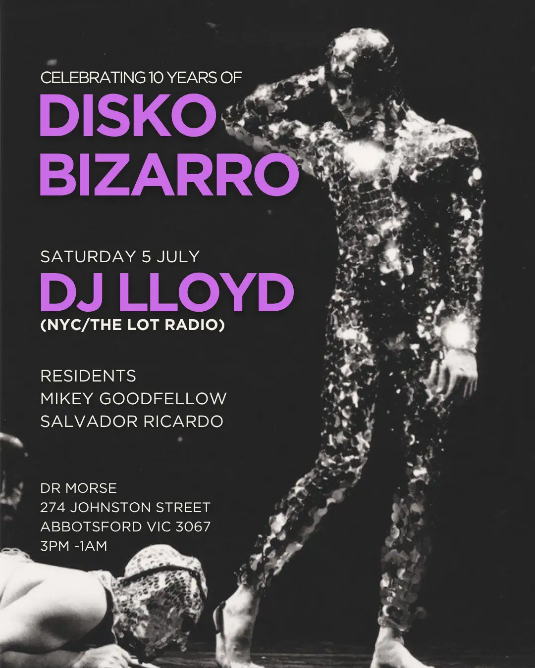 CELEBRATING 10 YEARS OF DISKO BIZARRO 10 years of musical chaos and the beautifully bizarre. Throughout the seasons, we’ve done it our way – loud, wild, and unapologetically. For our 10th bday, we have one of the founders and main heads behind the Lot Radio in NYC and the infamous Tiki Disco parties, DJ Lloyd. To everyone who’s danced, DJ’d, and the beautiful staff at Dr. Morse, this one’s for you. Here’s to more years of late nights, and the best kind of madness. DISKO BIZARRO