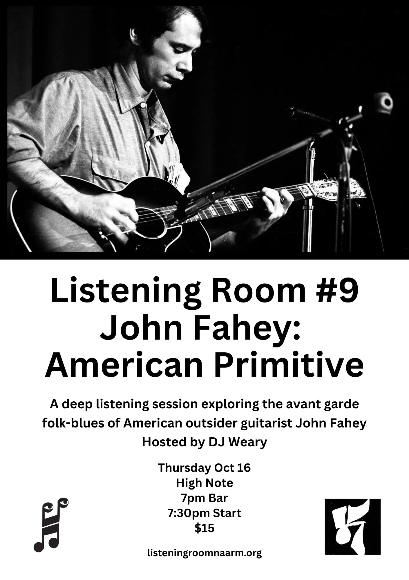 A deep listening session exploring the avant garde folk-blues of American outsider guitarist John Fahey. Hosted by DJ Weary. Thursday 16th October High Note 7pm Bar 7:30pm Start $15