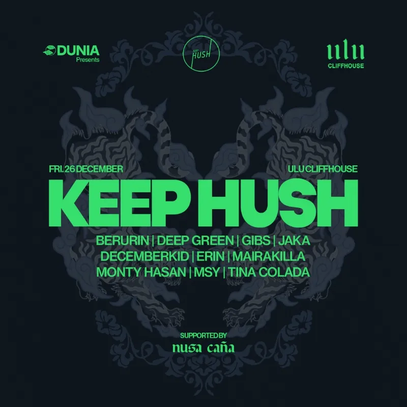 DUNIA presents: KEEP HUSH at Ulu Cliffhouse Friday, 26 December Keep Hush is a UK-based underground music platform known for its raw, unfiltered approach to documenting club culture. Their sessions capture intimate, high-energy dancefloors where DJs and artists are surrounded by the crowd, creating an atmosphere that feels true to real grassroots nightlife. They highlight emerging sounds, collaborate with local communities, and focus on honest, music-first experiences. For this Bali edition, Keep Hush links up with some of the island’s most dedicated DJs and artists for a one-night takeover at Ulu Cliffhouse. Expect an intimate floor, forward-thinking selections, and a crowd that comes early and stays present. Lineup: Berurin Deep Green Gibs J.S. Decemberkid Erin Mairakilla Monty Hasan MSY Tina Colada
