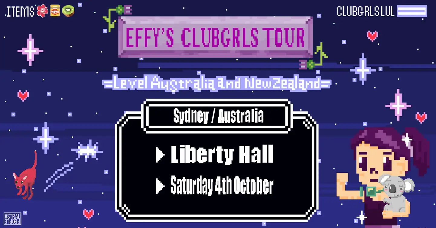 Astral People Presents... ▬▬▬▬▬▬▬▬▬▬▬▬▬▬▬▬▬▬▬▬▬▬ Effy October 4, 2025 - Sydney - Liberty Hall PRESALE: Mon 16 June, 10am AEST GA ONSALE: Tues 17 June, 10am AEST ▬▬▬▬▬▬▬▬▬▬▬▬▬▬▬▬▬▬▬▬▬▬ Club pressure incoming—UK powerhouse Effy is returning to Sydney for a one-night-only headline show at Liberty Hall, this Saturday 4 October. A producer and DJ redefining the contours of UK club music, Effy pulls from techno, house, breakbeat, and deep rave lineage to craft a sound that doesn’t follow trends—it sets them. This special return follows the runaway success of her Valentine’s Day 2024 collab with Mall Grab, iluv—a track that’s clocked over 16 million streams, dominated dancefloors worldwide, and featured in her debut Boiler Room Sydney set, marking a key moment in her global rise. From Fabric to Amnesia, and stages across Japan and Australia, Effy’s sets don’t just move bodies—they leave a mark. Sydney, prepare yourself. ▬▬▬▬▬▬▬▬▬▬▬▬▬▬▬▬▬▬▬▬▬▬ We pay our respects to the Gadigal people of the Eora Nation, and acknowledge their custodianship of these lands and waters; their culture and language; and their elders – past, present and emerging.