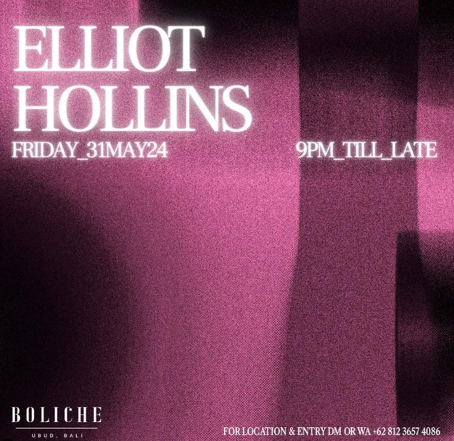 Join us for an unforgettable night of deep house and lo-fi music with ELLIOT HOLLINS at Boliche Bali. Get ready to groove to the mesmerizing beats and immerse yourself in the captivating atmosphere. Date: Friday, May 31, 2024 Time: 9:00 PM till late Venue: Boliche Bali Don't miss out on this fantastic event!