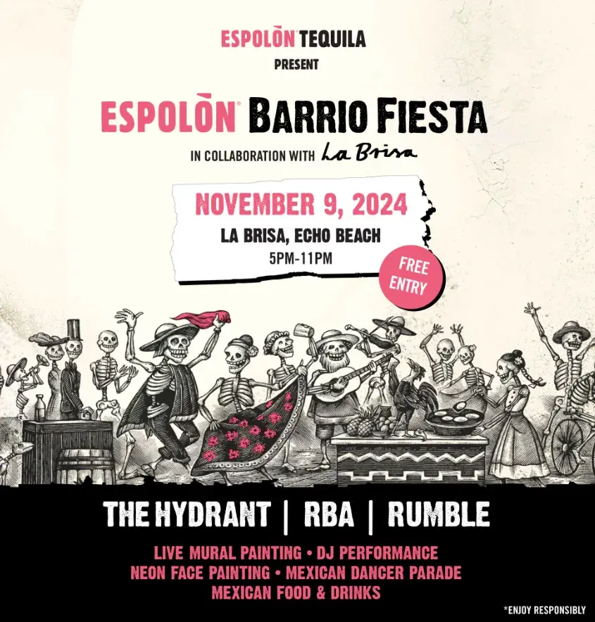 Join us for a lively evening at Barrio Fiesta, a celebration of life filled with vibrant energy and endless entertainment! This exciting event, brought to you by Espolòn Tequila and La Brisa, promises a night to remember. Indulge in delicious Mexican food specials prepared by La Brisa while sipping on expertly crafted drinks featuring Espolòn Tequila. Enjoy a thrilling live performance by The Hydrant and get ready to dance with DJ sets from RBA and Rumble, ensuring the music keeps the party going all night long. Experience the excitement of dance parades, LED water percussion performances, and mesmerizing glow-in-the-dark dancers that will light up the evening. To make the night even more special, we’re offering FREE activations! Take part in drink samplings and tequila tastings, witness live mural painting, and capture memories at our magnetic photo booth. Mark your calendar for November 9th, 2024, from 5 PM to 11 PM. Don’t miss out on this unforgettable celebration of culture and community!