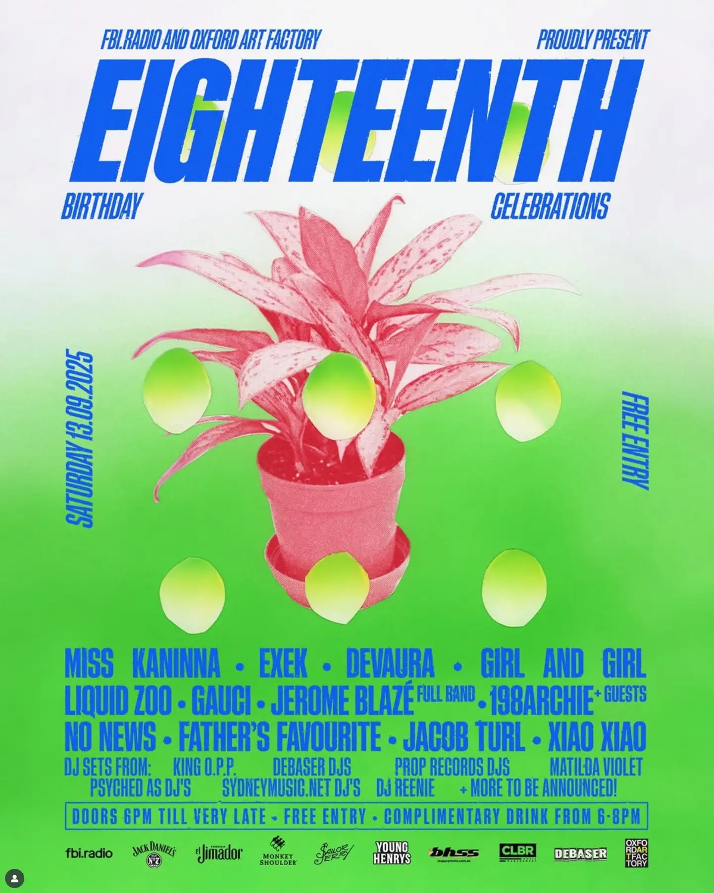 After 18 years at the heart of Sydney’s live music, art, and nightlife, Oxford Art Factory is officially coming of age and celebrating the only way they know how: with a party for the people. Come raise a glass at OAF’s “Coming-of-Age Party” on Saturday 13 September. FREE ENTRY. Catch incredible live acts and DJs, and enjoy a complimentary drink between 6-8pm. Presented by fbi.radio and Oxford Art Factory Proudly supported by Young Henrys, Sailor Jerry, El Jimador, Monkey Shoulder, and Jack Daniel’s FREE ENTRY. Capacity is limited and RSVP does not guarantee entry. ____________________________________________ We acknowledge that this event is held on the stolen lands of the Gadigal people of the Eora Nation. We pay our respects to Elders, past, present and emerging. Sovereignty was never ceded.