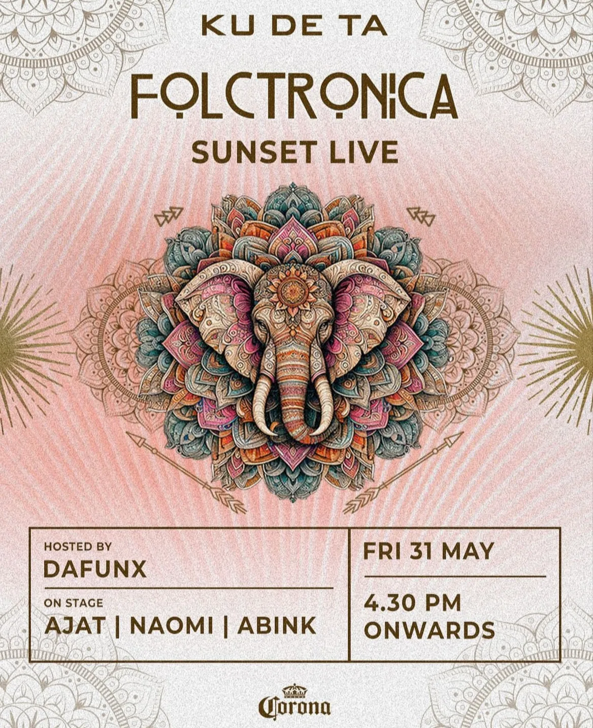 Our captivating live session, 'Folctronica,' is back at KU DE TA on Friday, May 31st, starting at 4:30 PM. This special event combines ancient rhythms with futuristic soundscapes, taking the audience on a mesmerizing journey. Created by Dafunx, with captivating live performances by Ajat, Naomi, and Abink. Immerse yourself in this harmonious musical fusion while enjoying the breathtaking Bali sunset - an experience bound to leave a lasting impression. Admission is free.
