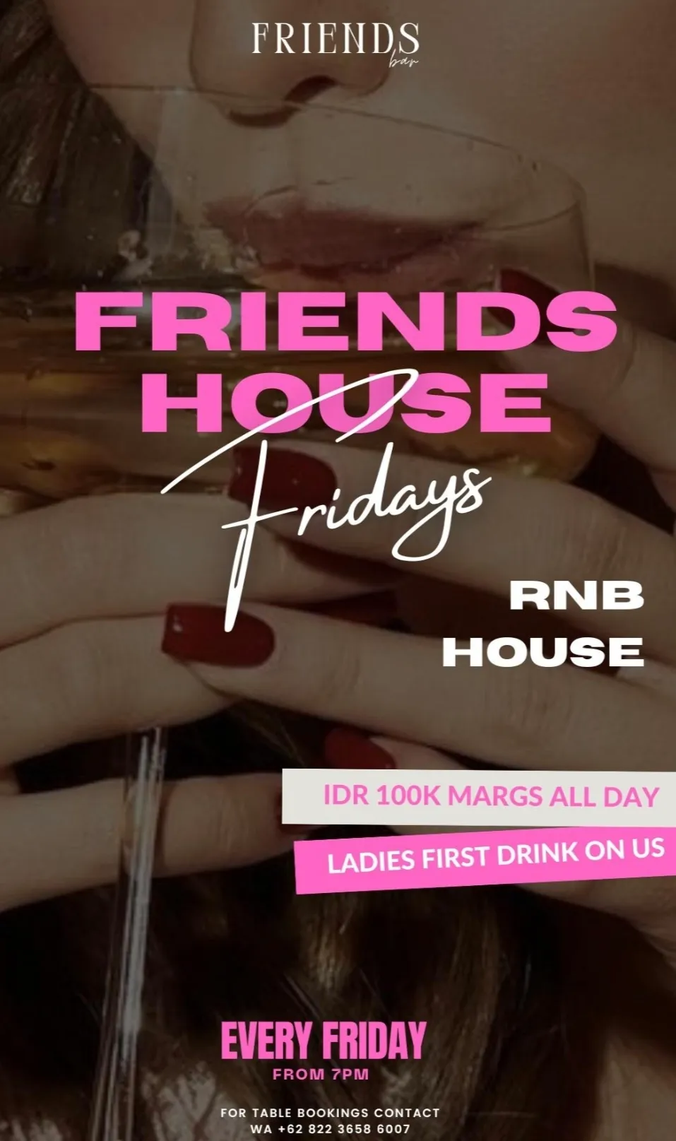 Kick off your weekend in style with Friends House Fridays! Every Friday night, immerse yourself in the vibrant sounds of R&B and house music, setting the perfect mood for a night of fun and relaxation. Enjoy refreshing IDR 100k margaritas all day long, and as a special treat, the first drink is on the house for all the ladies. Gather your friends and head over for an unforgettable Friday evening starting at 7:00 PM.