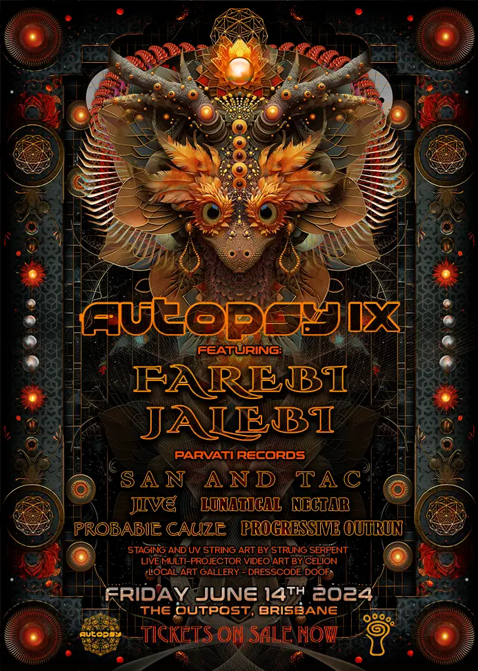 It's our 2nd birthday! To celebrate more than 2 years of Autopsy events, we're bringing you the best of the best... He's played Boom Festival. He's played Mo:Dem Festival multiple times. And after 2 years since his last performance at Autopsy, we cannot wait to welcome back the king of forest psytrance in Australia, Mr ๐๐ฎ๐ฟ๐ฒ๐ฏ๐ถ ๐๐ฎ๐น๐ฒ๐ฏ๐ถ! Combined with a bunch of brilliant local music makers and DJs, and the expanded staging and visual experience synonymous with Autopsy, weโre in for a belter of a party! 2-Hour mesmerising live performance by ๐๐ฎ๐ฟ๐ฒ๐ฏ๐ถ ๐๐ฎ๐น๐ฒ๐ฏ๐ถ of ๐ฃ๐ฎ๐ฟ๐๐ฎ๐๐ถ ๐ฅ๐ฒ๐ฐ๐ผ๐ฟ๐ฑ๐ Premium d&b Audiotechnik sound Custom Autopsy staging - upgrades in progress for our most hypnotic visual experience yet Fully mapped dual visual projection system Wide range of night psy styles from progressive through twilight and forest to hi-tech; each set faster than the last Staging and UV String Art by ๐ฆ๐๐ฟ๐๐ป๐ด ๐ฆ๐ฒ๐ฟ๐ฝ๐ฒ๐ป๐ Staging and Visual Projection by ๐๐ฒ๐น๐ถ๐ผ๐ป Ecofriendly wearable artworks by ๐ป๐๐ฟ๐ฎ๐๐ฒ๐๐ฎ๐ฟ๐ฑ Psychedelic art gallery featuring ๐ฆ๐ฒ๐น ๐๐ป๐ฒ ๐๐ฟ๐ UV bodypainting by ๐ฅ๐ถ๐ฐ๐ต๐ถ๐ฒ ๐๐ฟ๐ถ๐ณ๐๐ฎ๐ฟ๐ Autopsy merch available Hosted at a dedicated music venue, The Outpost is acoustically treated for optimal audio clarity, and centrally located in the middle of Brunswick St mall. Plenty of late trading food and drink options, busses, trains, taxis, overnight parking and accommodation all nearby. ๐๐ถ๐ป๐ฒ๐๐ฝ In running orderโฆ * ๐ฃ๐ฟ๐ผ๐ด๐ฟ๐ฒ๐๐๐ถ๐๐ฒ ๐ข๐๐๐ฟ๐๐ป - Dark Progressive Hive Bookings * ๐ฃ๐ฟ๐ผ๐ฏ๐ฎ๐ฏ๐ญ๐ฒ ๐๐ฎ๐๐๐ฒ (dj set) - Twilight Autopsy Productions * ๐ฆ๐ฎ๐ป ๐ฎ๐ป๐ฑ ๐ง๐ฎ๐ฐ - Melodic / Night Psy Independent * ๐๐ฎ๐ฟ๐ฒ๐ฏ๐ถ ๐๐ฎ๐น๐ฒ๐ฏ๐ถ [Mel] - Parvati Forest Parvati Records * ๐๐ถ๐๐ฒ - Dark Forest Transubtil Records * ๐๐๐ป๐ฎ๐๐ถ๐ฐ๐ฎ๐น ๐ก๐ฒ๐ฐ๐๐ฎ๐ฟ - Hi-Tech / Psydub Independent ๐๐ฎ๐ฟ๐ฒ๐ฏ๐ถ ๐๐ฎ๐น๐ฒ๐ฏ๐ถ Parvati Records Farebi Jalebi has spent the last decade producing and playing his own music at parties and festivals all around the globe. In 2010 Farebi Jalebi was added to the roster of the legendary Parvati Records. Ever since, heโs been developing a flavour of his own with bouncy bass-lines, melodic scapes and punchy grooves. Each track has a different twang and tells its own peculiar tale, and together they are woven into dramatic sets with a mix of emotion and insanity. ๐ง๐ฟ๐ฎ๐ป๐๐ฝ๐ผ๐ฟ๐ The entrance is next to the Sound Garden bar, in the Brunswick St mall (aka the valley mall). - Bus / Train - Plenty of public transport to the fortitude valley train station and bus stops. - Car - $19 overnight parking (4pm - 6am) at Cornerstone Parking, Warner St. No pre-booking - just drive up! Must enter after 4pm and exit before 6am. Secure parking Warner st is also close by. Street parking also available around the valley (free). - Taxi / Uber - Drop off at the Brunswick St mall. ๐ง๐ต๐ฎ๐ป๐ธ ๐ฌ๐ผ๐ Your ticket purchase funds all the music producers, DJs, performers, visual and video artists, stage designers, production crew, venue staff, promoters and your local event organisers involved in this event. Thank you for your support