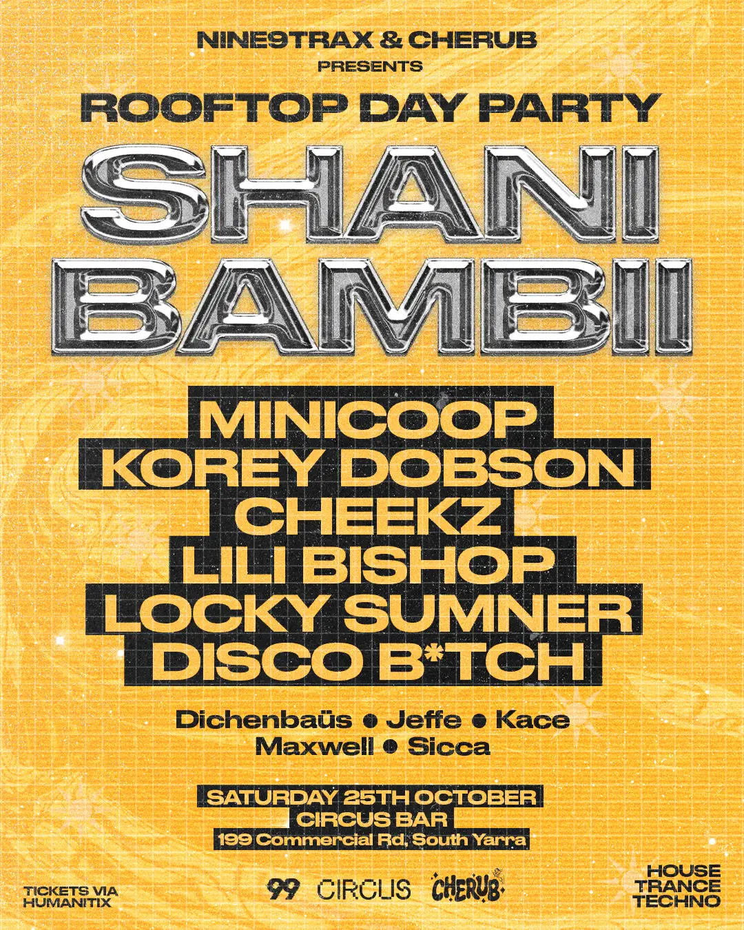 Cherub & NINE9TRAX come together to present a Rooftop Day Party that’s all about quality music and great atmosphere. Leading the lineup are SHANI and BAMBII, supported by an outstanding mix of local talent: Cheekz, Dichenbaüs, Disco B*tch, Jeffe, Kace, Korey Dobson, Lili Bishop, Locky Sumner, Maxwell, Minicoop, Sicca. Join us for a full afternoon and evening of house, techno, and trance, all set against the backdrop of a rooftop setting that’s perfect for spring. Saturday, October 25th 3:00 PM – 10:00 PM Rooftop Day Party Early arrival is recommended to enjoy the full experience. Important Info: No dickhead policy: Disrespectful behaviour will not be tolerated. Speak to staff or DM us on Instagram (@cherub.sounds / @nine9trax) if you have any concerns. 18+ only. Valid photo ID required. No refunds. $5 before 5PM tickets: Entry valid until 5pm. All other tickets: Entry valid until 9pm.
