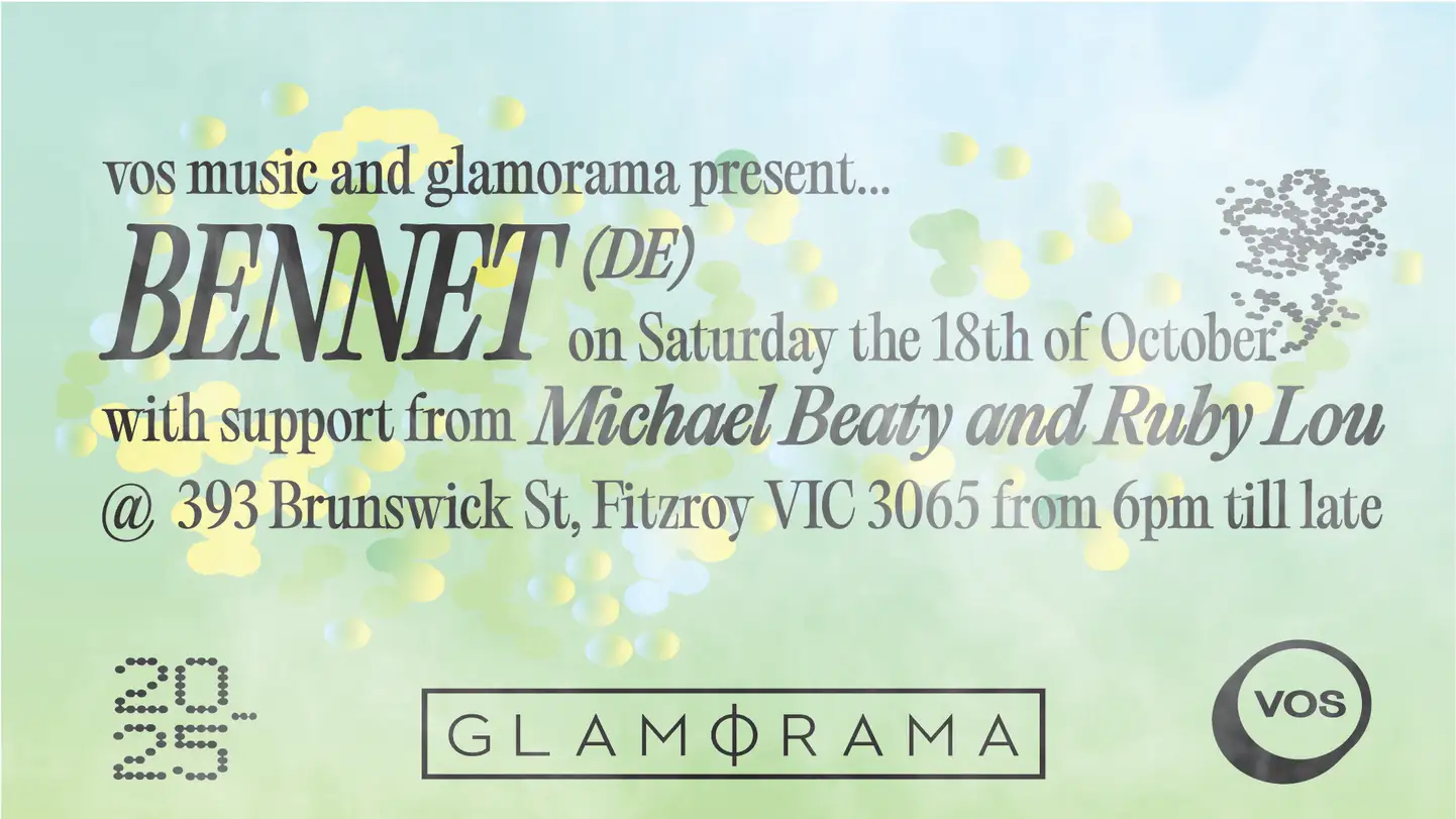 VOS x GLAMORAMA PRES. BENNET 🩵 We’re thrilled to host Bennet for his Australian debut show at Glamorama. Hailing from Hannover, Bennet has garnered attention for his spellbinding + sensual selections. Rightly so, he has featured at institutions the likes of Bassani, Blitz, Else and Panorama Bar. He has rose to prominence in the queer party circuit, commanding dance floors at Adonis, Multisex and Queerpool. Bennet prides himself on being a vinyl-only selector, with each press of wax evoking a unique blend of groove and warmth, but all bound by a singular purpose: imbuing the dance floor with passion. Alongside him are two of our favourite selectors ~ Michael Beaty + Ruby Lou ~ soundtracking the afternoon, going one deeper as the night evolves. •• Glamorama Bar Saturday | October 18th [18:00 - LATE] Garden from 6pm ~ Main Room from 9pm •• VOS is a party for all. A party that focuses on the delivery of exceptional music, crowd control, and importantly, a space where you can be true to yourself. Find VOS. Find YOU. Glamorama & VOS would like to acknowledge the Wurundjeri Woi Wurrung people, the Traditional Custodians of the land on which this event will take place. We pay our respects to their Elders past, present, and emerging. We extend that respect to all Aboriginal, Torres Strait Islanders, and other First Nations people. If you identify as Aboriginal and/or Torres Strait Islander, please message us to access an allocation of complimentary tickets. Any questions or queries regarding accessibility of Glamorama are encouraged to contact us directly by messaging our social pages or emailing contact@glamoramabar.com Tickets available through on Humanitix