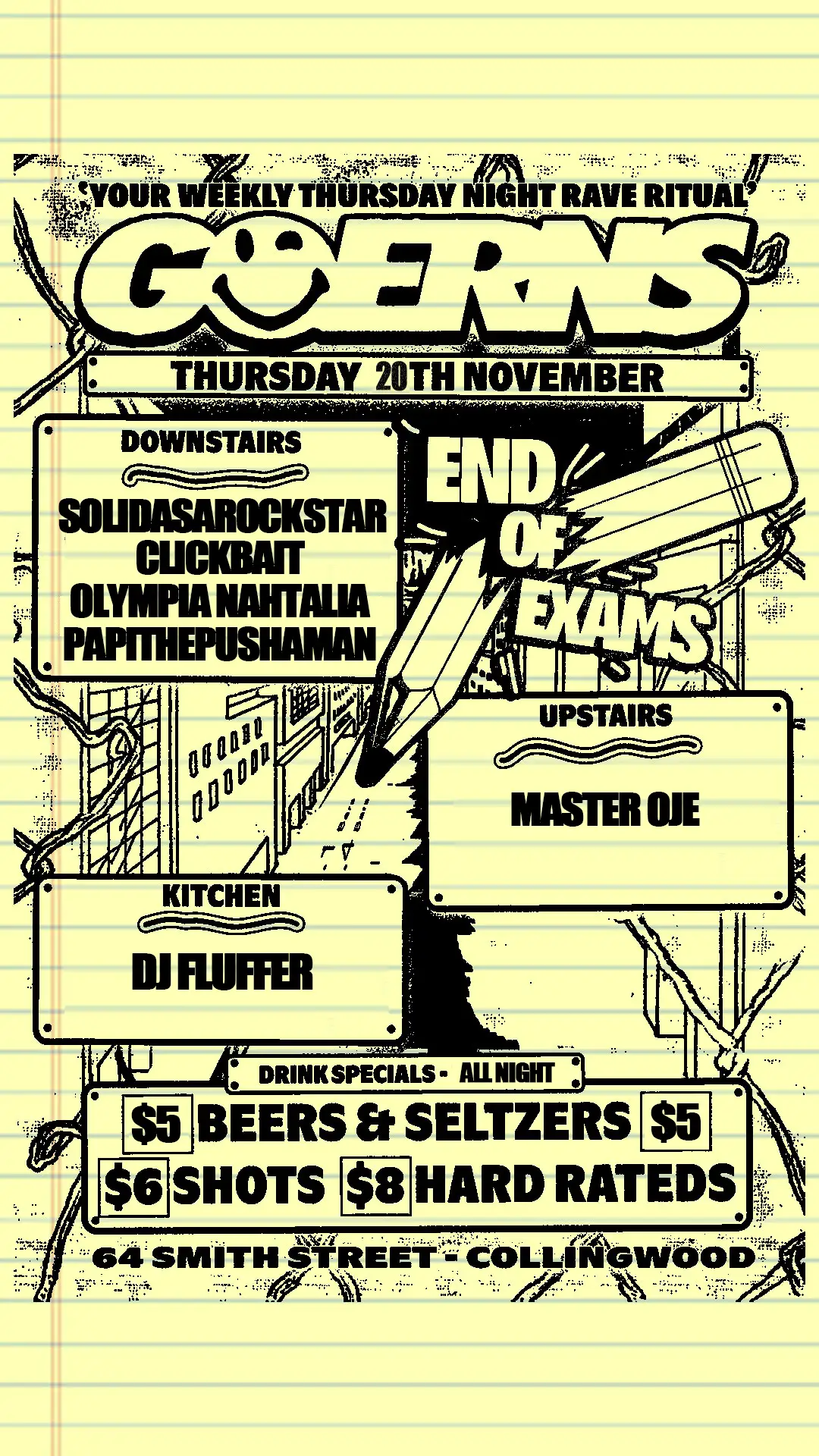 //downstairs SOLIDASAROCKSTAR CLICKBAIT OLYMPIA NAHTALIA PAPITHEPUSHAMAN //upstairs MASTER OJE //kitchen DJ FLUFFER
