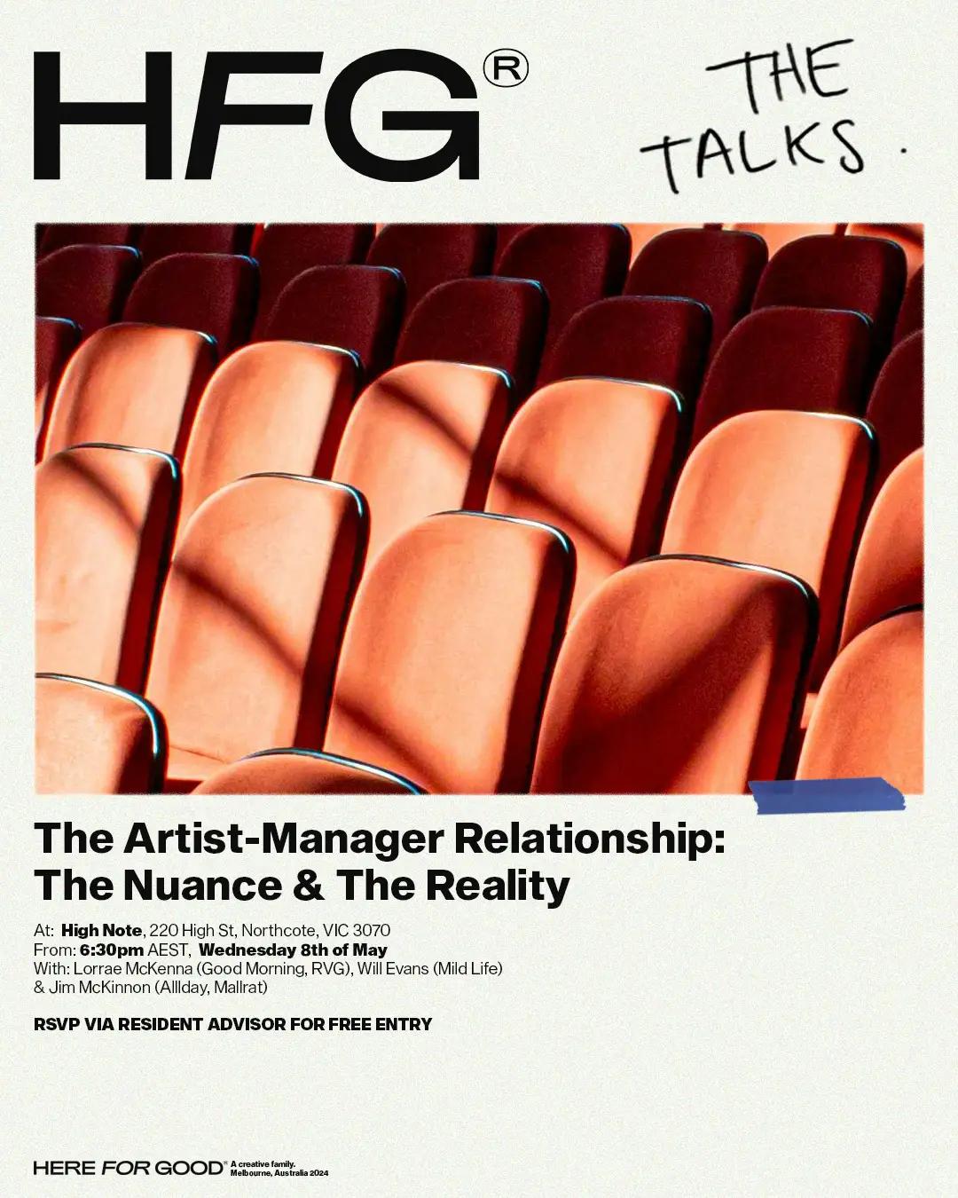HFG Talks is back at High Note and next Wednesday (May 8th), we'll be unpacking the subtleties and realities of the artist-manager relationship. Featuring insights from Lorrae McKenna (Good Morning, RVG), Will Evans (Mild Life), and Jim McKinnon (Allday, Mallrat), we'll venture into the expansive realm of artist management and try to demystify its complexities... How do you foster and sustain trust within the artist-manager dynamic? What qualities do you prioritize when considering an artist for management? In navigating the ever-changing landscape of the music industry, how do you ensure financial stability for both the artist and management? And why do certain managers choose to step away from the industry altogether? We'll delve into these questions and more! Stick around after for chats with the HFG team, panelists or to hang at High Note - we loved putting names to faces last time and wanna keep up the IRL hangs. Schedule 6:30 - 7: Arrive and get comfy 7 - 8: Panel 8 - 8:30: Questions 8:30 onwards: Stay back and chat