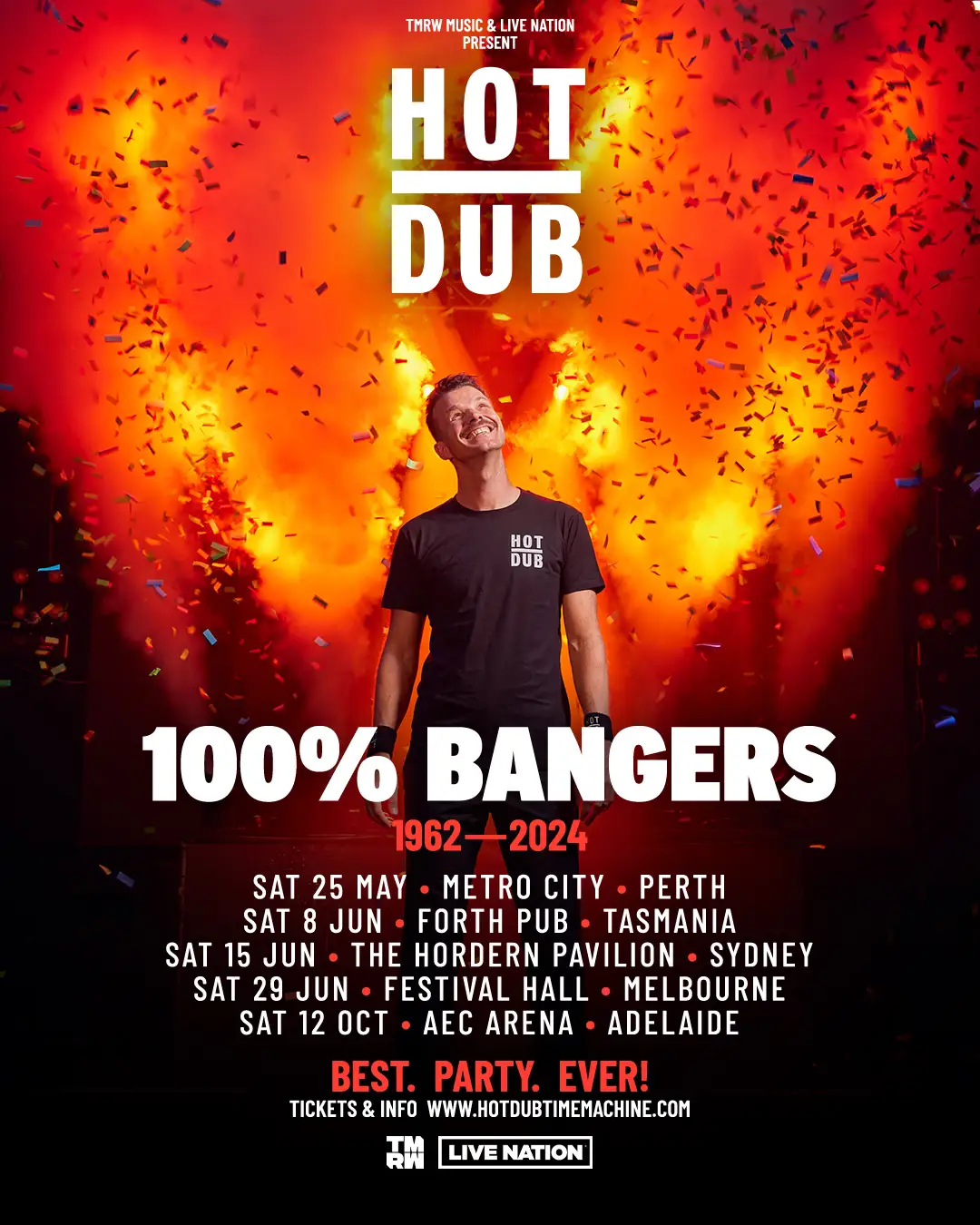 Hot Dub Time Machine is turning up the energy for his next run of headline shows across Australia – get ready for 100% BANGERS! Having consistently delivered the best party rocking shows around Australia and the world over the past decade, Hot Dub Time Machine is back with a brand-new show, celebrating the best in dance music from 1962-2024. Expect nothing but 100% Bangers, in what will be an EPIC show you will not want to miss, as always delivering on the promise of the BEST. PARTY. EVER!Since first launching his time-travelling, ‘dance-through-the-decades’ audio-visual party concept in 2011, Sydney’s Tom Lowndes has grown Hot Dub Time Machine into an absolute monster. Showcasing songs from every decade and genre of music, weaving it into one expansive, electrifying, music history lesson – Hot Dub has been welcomed by international audiences with open arms; having travelled the world with his iconic, celebratory shows. Hot Dub is a main stage festival regular, bringing his unique form of joy to the world’s biggest festival stages including Coachella, Tomorrowland, Bestival, Splendour in the Grass, Falls, It’s The Ship to name but a few.His headline tours continue to thrill fans across Australia, playing to sold-out crowds at the iconic Hot Dub on the Harbour now in its second year, Boogie at The Hordern (Hot Dub’s dream venue!) and a slew of headline shows through UK including Hot Dub Rae Machine at Printworks, London and Hot Dub Boogie selling out 5,000 tickets to his dedicated Glasgow crowd.Add to his party antics at massive sporting events, including: the Australian Open Tennis, Formula One, Hong Kong Sevens, Cricket and more. Hot Dub is an ever-growing experience which continues to bring together diverse crowds, the power of awesome music and good times.Hot Dub Time Machine. Always the Best. Party. Ever!