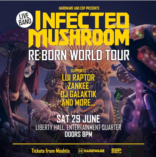 Infected Mushroom return to Australia with their newly crowned REBORN tour to celebrate the release of their 2024 killer new album REBORN, featuring 9 killer new psy-fused weapons! The 4 piece live show sees the band play a mix of future classics and past monsters over 90 minutes, typical of their explosive high energy sets they’re famous for. —------------------------------------ After twenty-five years making waves in the scene, Infected Mushroom has earned their reputation as a groundbreaking legend in electronic music. Twice ranked amongst the world’s ten best DJs by DJ Magazine, with streaming numbers in the tens of millions and a cult following of die-hard fans, the Israel-bred, LA-based duo has created one of the most powerful kingdoms in the world of electronic music. Infected is world-renowned for their sonic innovations, genre-defying sound, and unrivaled production quality. This trademark sound is cultivated through hypnotic arrangements, layered melodies, and a willingness to blur the lines of genre. —------------------------------------ Following IM25, released in 2022 to commemorate their 25-year anniversary, Infected Mushroom is back with a new album offering a fresh take on some old classics. REBORN features nine tracks, all of which are reimagined, re-recordings of old fan-favorites from the 1990s and beyond, including Release Me, Dancing with Kadafi, and Disco Mushroom. The re-recorded tracks retain the original composition but with a tight, fresh sound production that brings the audio back to life in 2024. REBORN is a must-have for Infected Mushroom fans of all ages. It’s a celebration of the duo’s groundbreaking contributions to Psytrance and a testament to their enduring legacy. REBORN is available now on all major streaming platforms, as well as limited edition double-gatefold high quality vinyl.