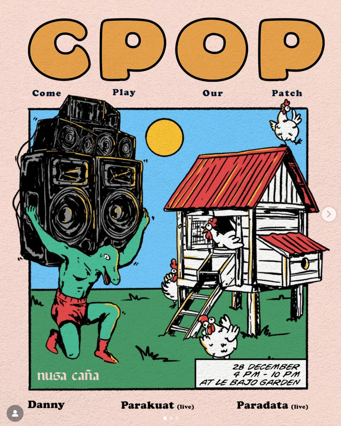 CPOP is back in the garden 🔊 Come Play Our Patch returns for an intimate afternoon of live electronic improvisation at Le Bajo Garden, a Sunday wind-down staple 😌 No presets, no repeats. Just spontaneous rhythms, evolving textures, and melodies born and gone in the same moment. Bring your friends, bring your dog! As the afternoon starts, melt into the grass with melodious chord progressions and ambient. Expect an exploratory sonic playground where anything can happen as we get deeper into the night. Featuring: Danny Parakuat (Live) Paradata (Live) Sunday, 28 December 2025 4PM – 10PM Le Bajo Garden