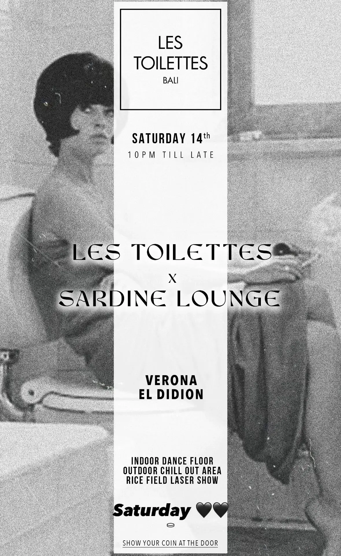 Get ready for an unforgettable night at Les Toilettes x Sardine Lounge. This event promises an exciting experience with two incredible artists: Verona and El Didion on the decks, spinning the perfect tunes to keep you dancing all night. The venue offers a vibrant indoor dance floor and a relaxing outdoor chill-out area, so you can enjoy the best of both worlds. Plus, don't miss the stunning rice field laser show, adding a magical touch to the evening. Entry: Show your coin at the door for access to this amazing night. Come join us for a night of great music, incredible vibes, and a celebration you won't forget!