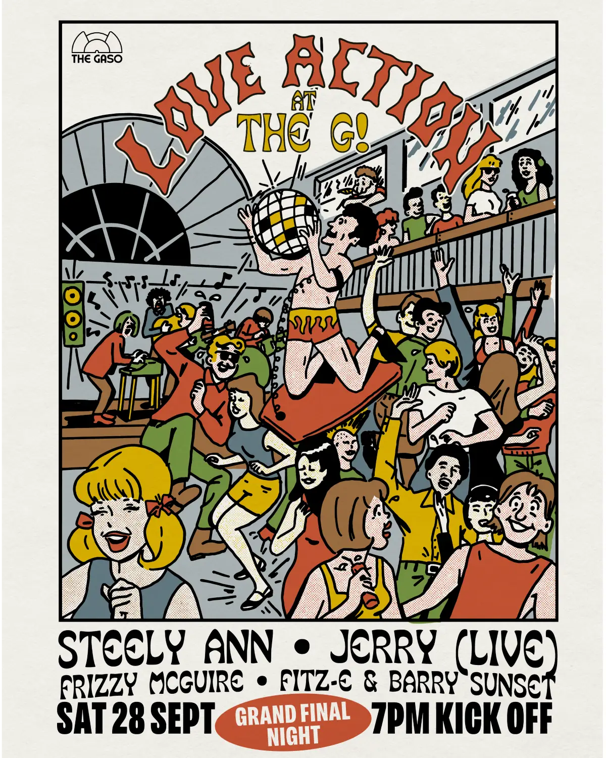 LOVE ACTION - The surf themed disco from outer space hits quite possibly the biggest day on the calendar at the prestigious and debaucherous Gasometer Hotel. A GRAND FINAL NIGHT special, featuring Love Action's first live performance from "Jerry". From 7PM, expect Cosmic Disco, 80s Synth Pop, Italo, Rock, Prog House, and anything and everything inbetween from some of the best disk jockeys on the local circut. At 9pm JERRY will grace the stage, the 6 piece live funk machine playing a set inspired by the sound of Love Action, with vocalist Liv Mirrington. It can't be a granny day afterparty without some live music - Having just sold out the Curtin Hotel, Jerry will bring a live performance of the cosmic disco sound to get your body moving. PLUS Extended sets from local DJ guns Steely Ann (7-9pm), Spin Club founders Fitz-e and Barry Sunset (10pm-1am), as well as Love Action superstar Frizzy Mcguire to tick you over your 100th froth of the day as she ups the BPMS well into the AM, pumping progressive house and electro funk through the soundsystem 1-3AM for the dancers still standing.