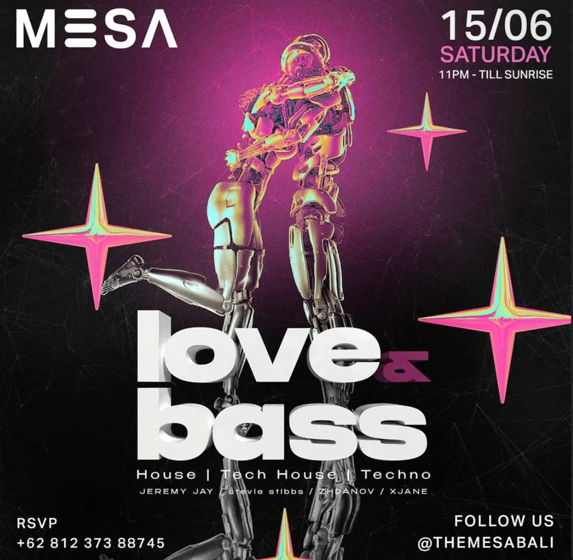 Embark on an epic journey from sunset to sunrise with Love & Bass! Join us from 11 PM to 7 AM for the ultimate tech house experience in Bali. The venue opens at 10 PM, setting the stage for an unforgettable night. Featuring a stellar lineup including @jeremy_jayyy, @steviestibbs, @heyzhdanov, and @xjane08, the party promises non-stop excitement and pulsating beats. As the night progresses, indulge in late-night promos starting from 2 AM onwards. Treat yourself to tacos and a tequila shot for just 99K, or enjoy 2 for 1 selected cocktails and spirits. For those on the guest list, enjoy free entry before 4 AM. Walk-ins are welcome with an FDC of 250K, which includes a drink voucher. Don't miss out on this unforgettable night of Love & Bass!