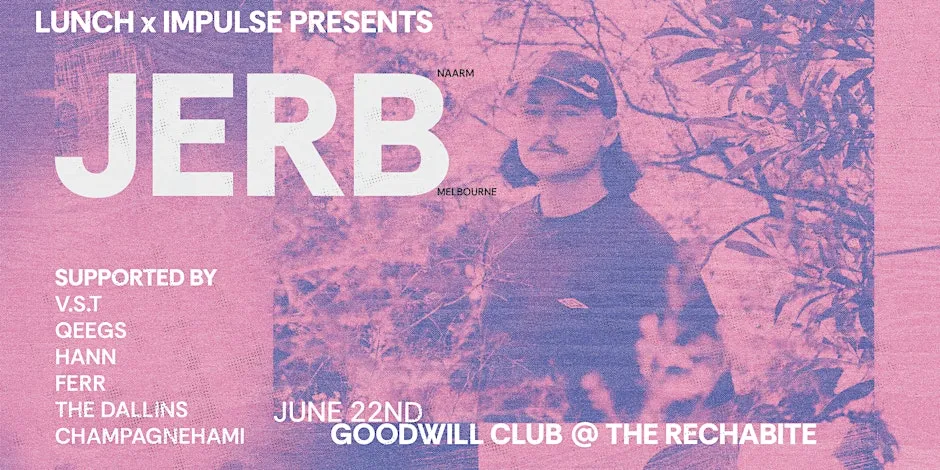 Impulse and Lunch welcome JERB to Perth this June 💥 Jerb has had an immediate impact in the Naarm scene since his move down south from Sydney. His production is a blend of rave inspired techno, hard hitting grooves and breakbeat that has translated into phenomenal releases, which have been doing the rounds throughout Australia's underground techno scene. Jerb isn’t a one trick pony, as his DJing skills and track selection have played a major role in his come up. Having graced the decks throughout Melbourne and Sydney, some of Jerbs highlights include Beyond the Valley, Xe54 and Shelter. L I N E U P ✨ JERB (Naarm) V.S.T Qeegs Champagnehami The Dallins Hann Ferr