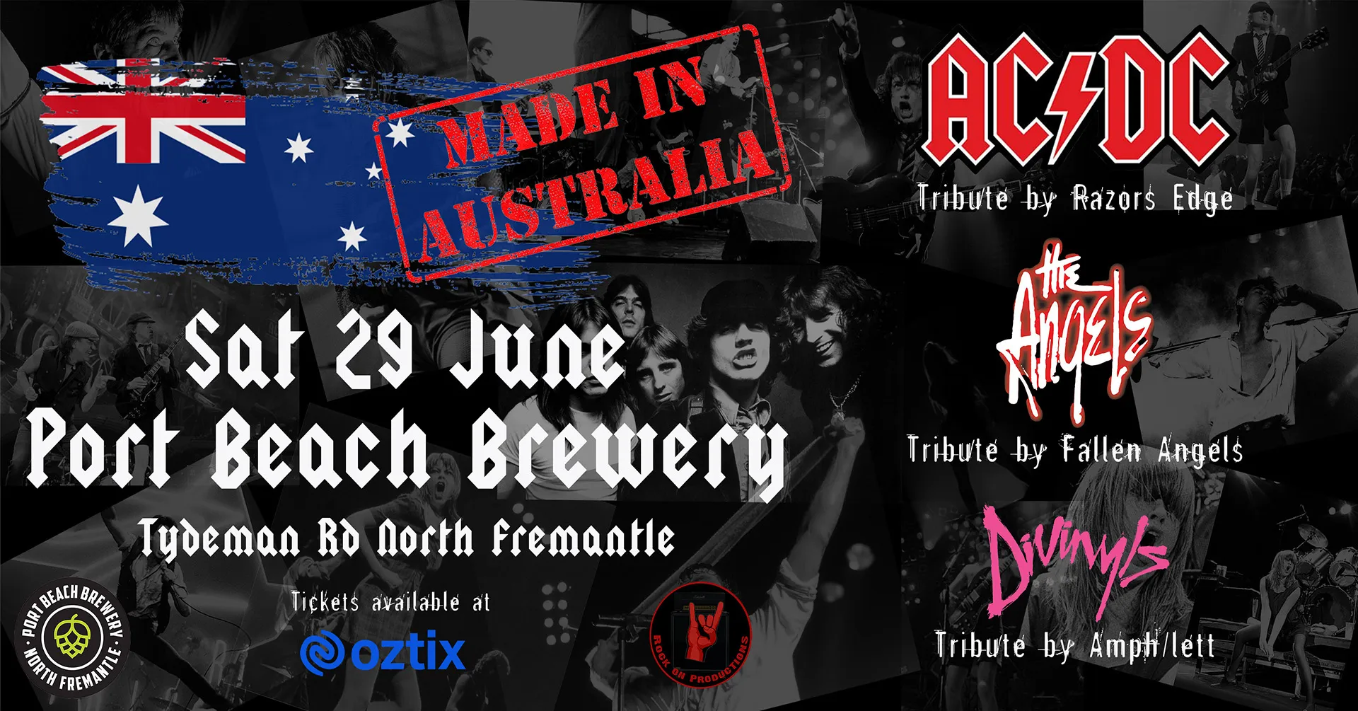 Made in Australia features some of the best local Australian Tribute acts. Razors Edge, Fallen Angels and Amph/lett are seasoned performers and have come together to recreate and pay tribute to the legendary Rock Bands; AC/DC, The Angels and The Divinyls. The show is on Saturday the 29th of June at the Port Beach Brewery Tydeman Rd North Fremantle. With powerful vocals and thumping backline, you will be transported back to the 70's/80's to bang your head and sing along to all the classics. Performing at the Port Beach Brewery on a large stage with full PA and lightshow. In the words of Molly “Do yourself a favour” This is one not to be missed. Doors Open 7pm